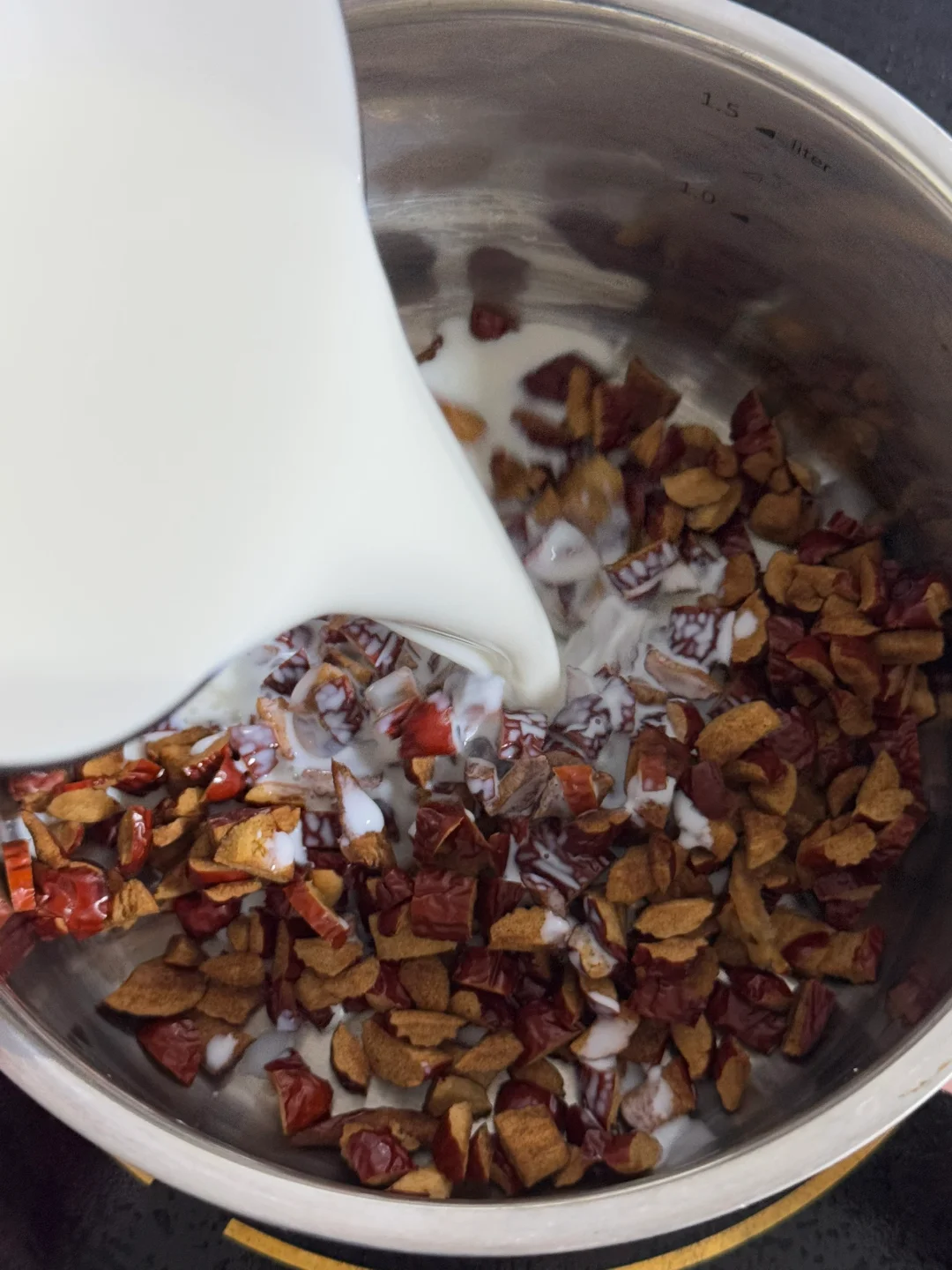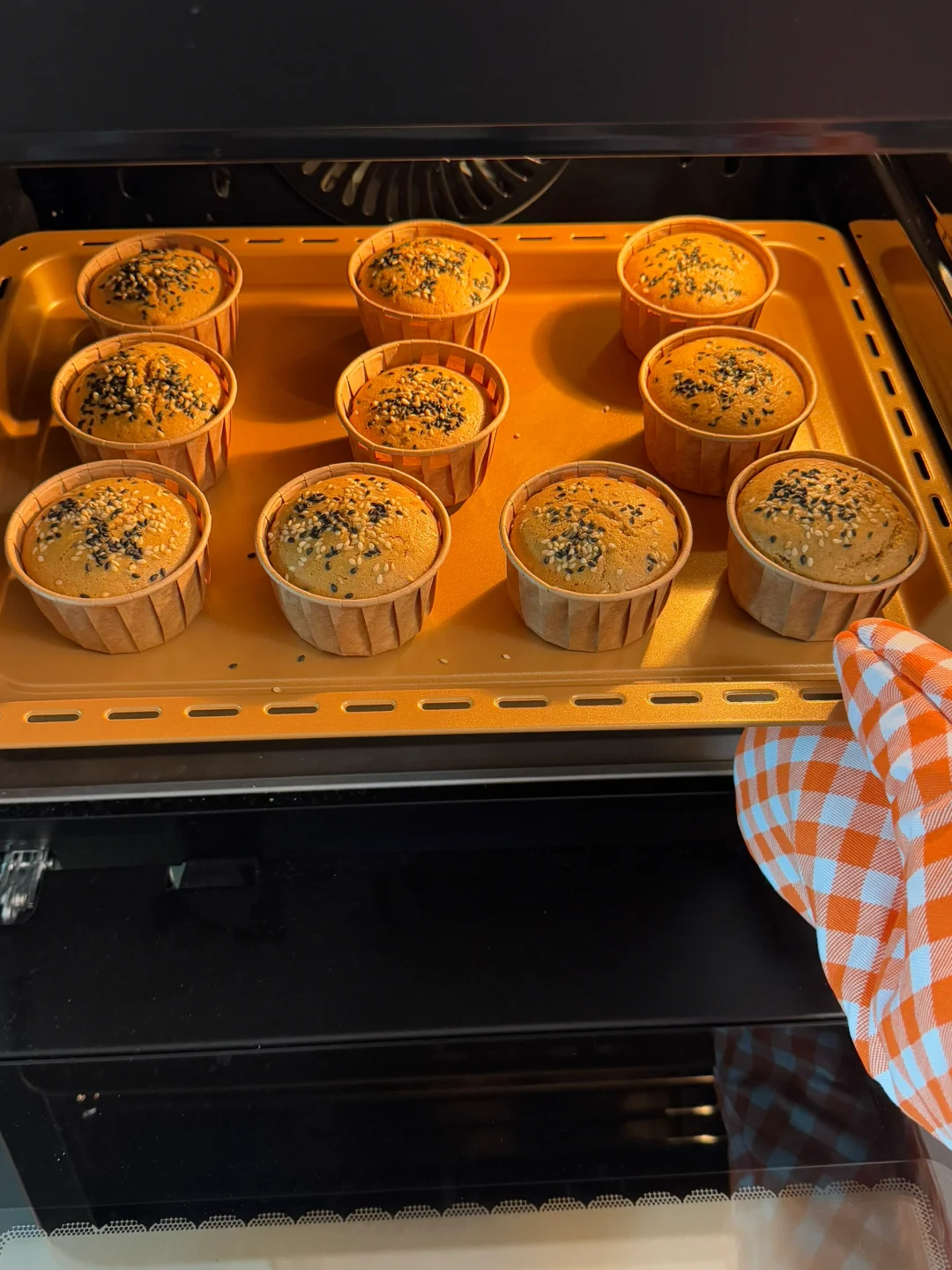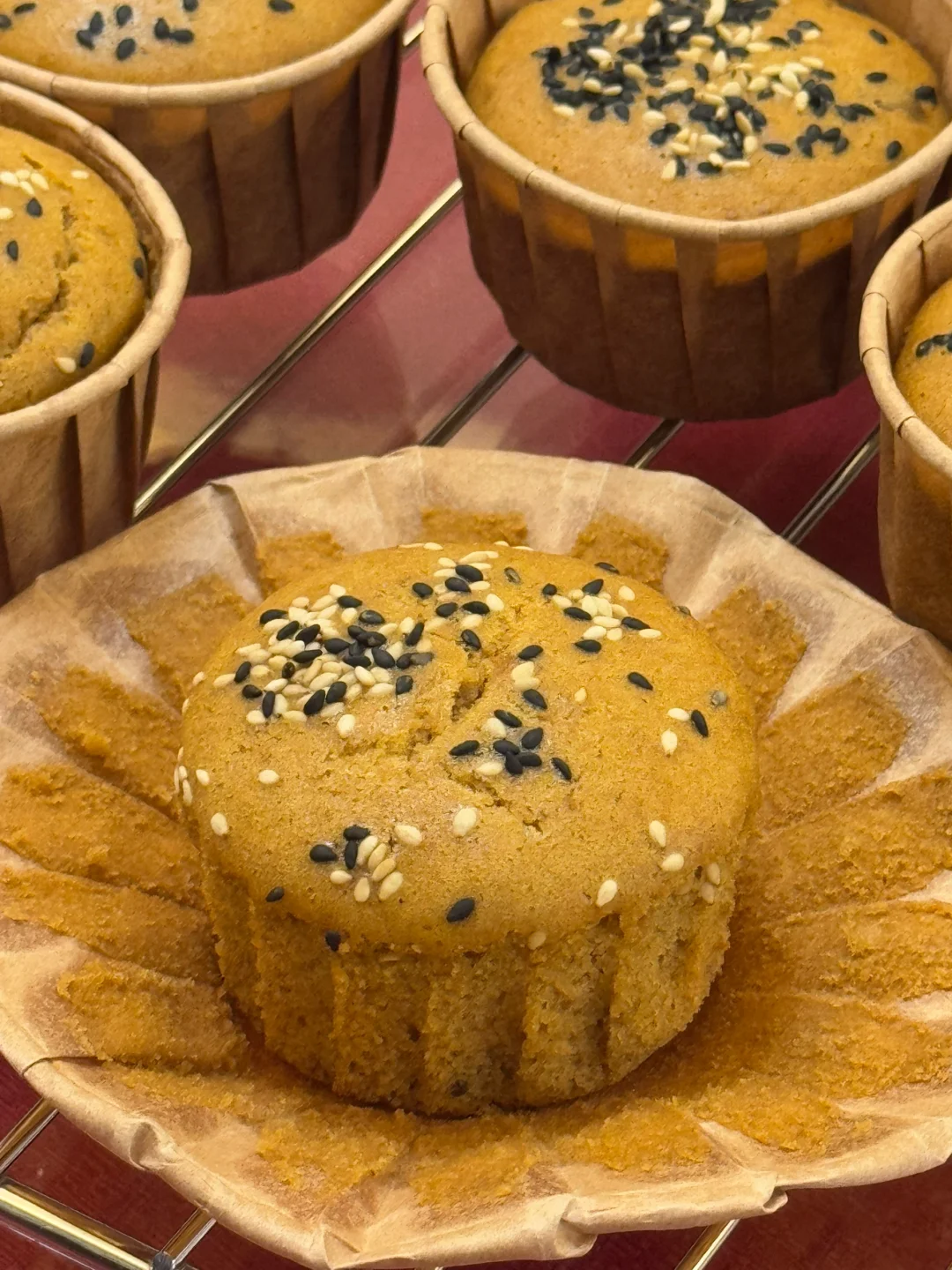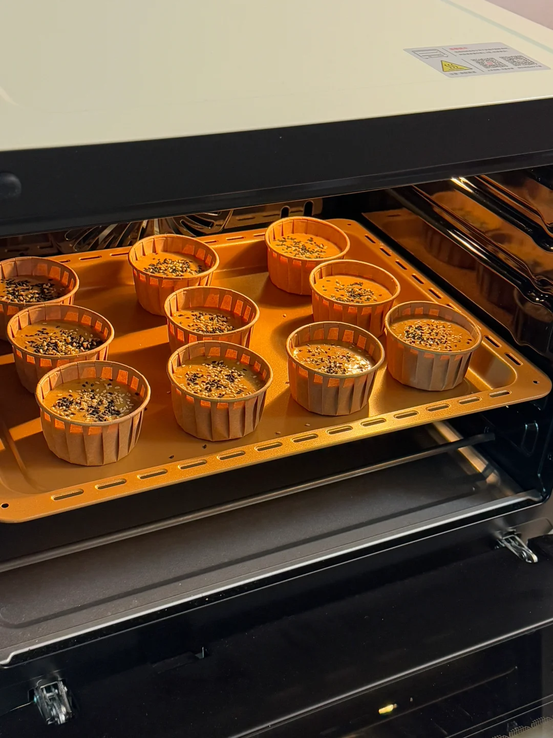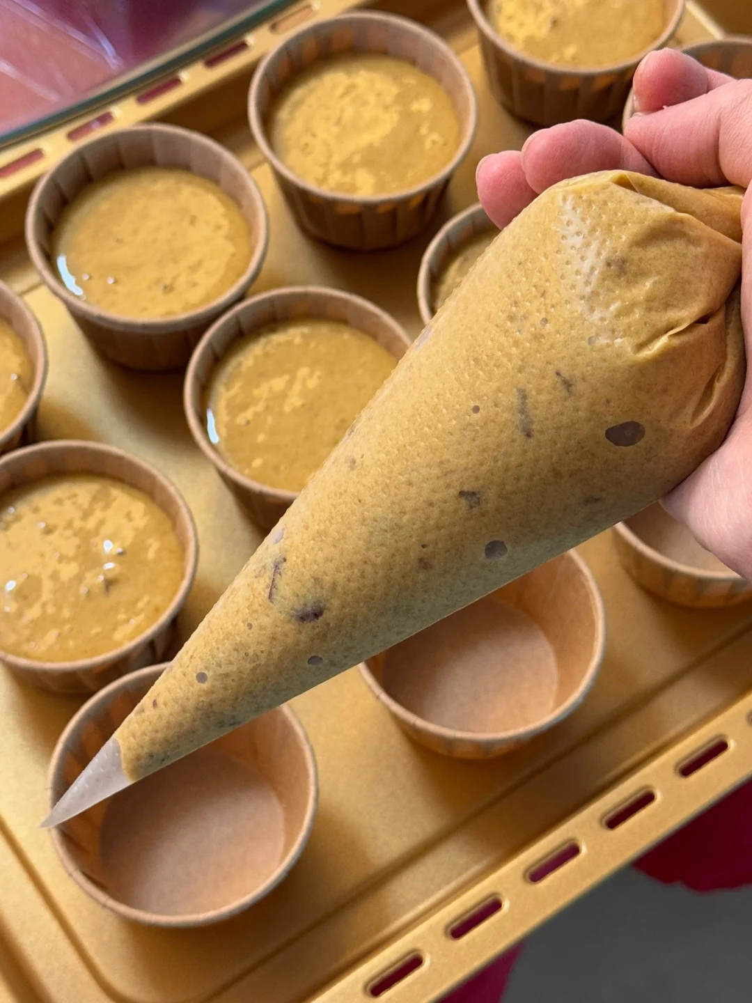 🌷食材: 红枣100g 鸡蛋5个 红糖70g 纯牛奶120g 玉米油80g 低筋面粉160g 泡打粉3g 🌷做法: 1.红枣切碎,放入奶锅中,加入纯牛奶、小火炒软,加入红糖炒至稍微浓稠。 2.枣泥中加入鸡蛋、盐,打发至体积膨大发白,画8字不易消失。 3.筛入低筋面粉、泡打粉,用刮刀翻拌均匀。 4.放入裱花袋,挤入纸杯中,撒芝麻,烤箱提前预热,150度烘烤30分钟。 🌷满屋飘香,枣香浓郁。