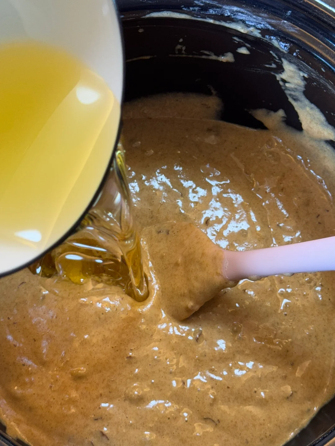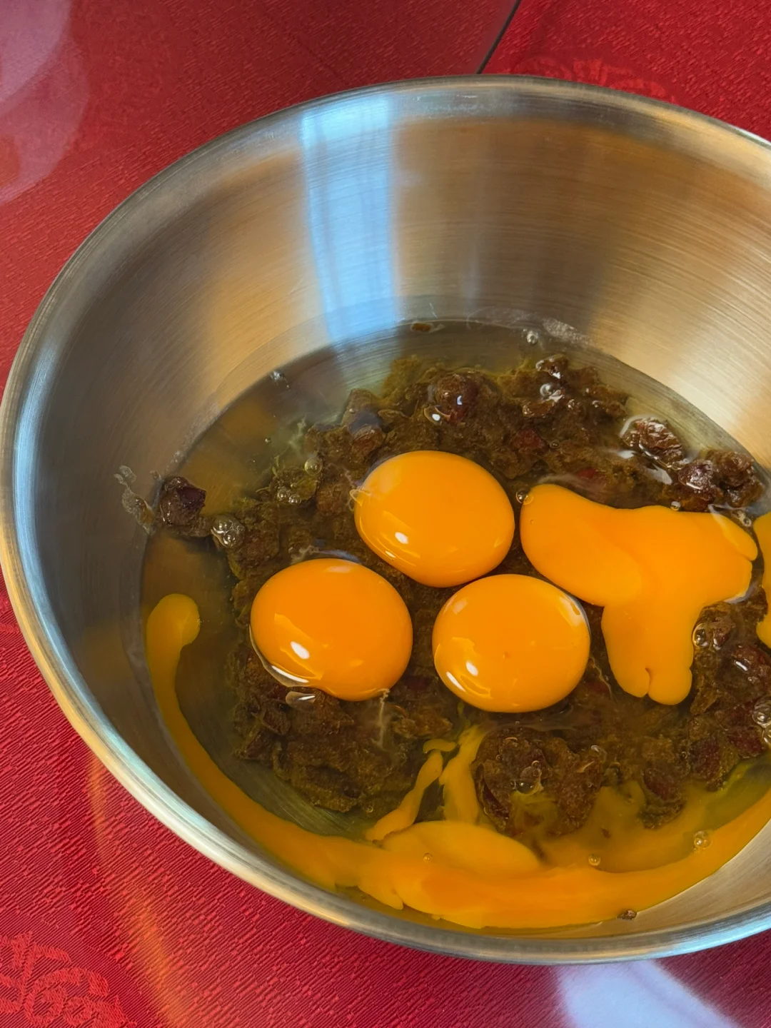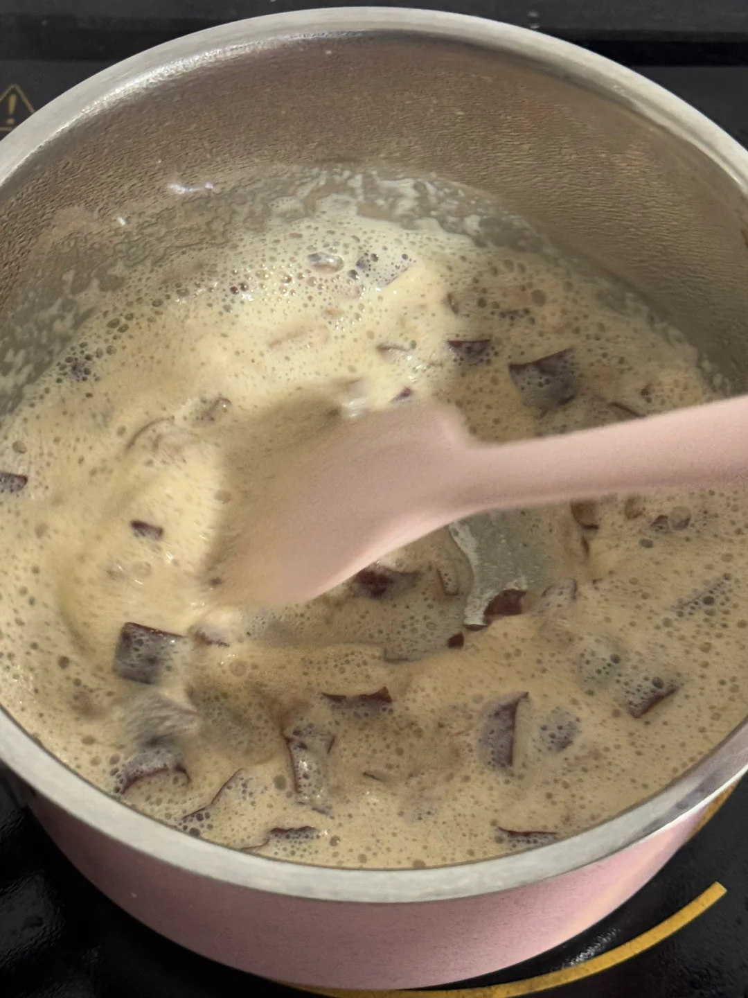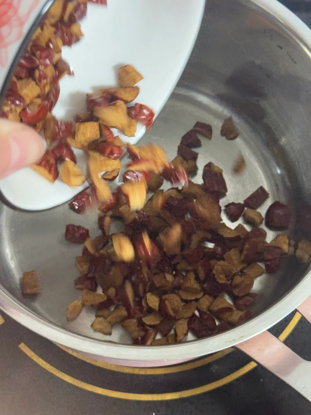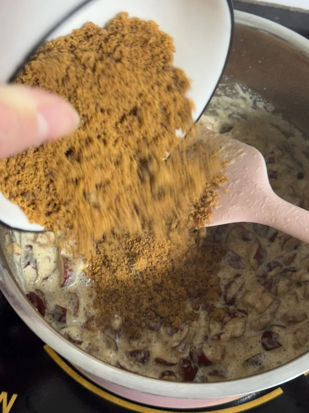 🌷食材: 红枣100g 鸡蛋5个 红糖70g 纯牛奶120g 玉米油80g 低筋面粉160g 泡打粉3g 🌷做法: 1.红枣切碎,放入奶锅中,加入纯牛奶、小火炒软,加入红糖炒至稍微浓稠。 2.枣泥中加入鸡蛋、盐,打发至体积膨大发白,画8字不易消失。 3.筛入低筋面粉、泡打粉,用刮刀翻拌均匀。 4.放入裱花袋,挤入纸杯中,撒芝麻,烤箱提前预热,150度烘烤30分钟。 🌷满屋飘香,枣香浓郁。