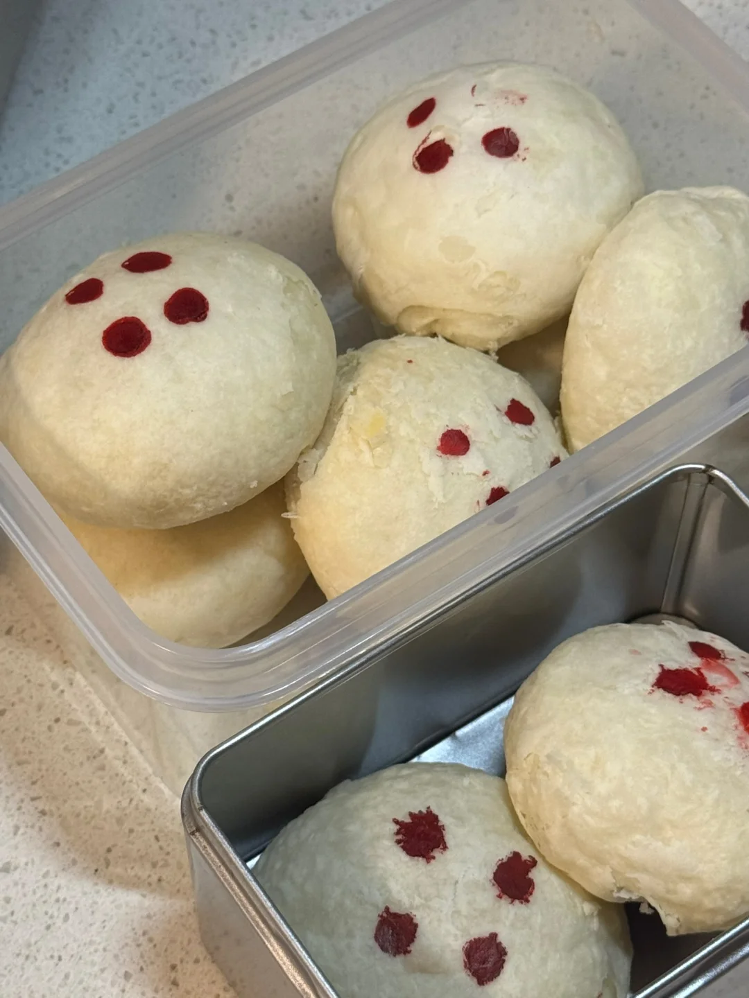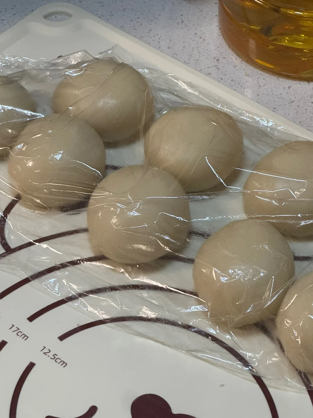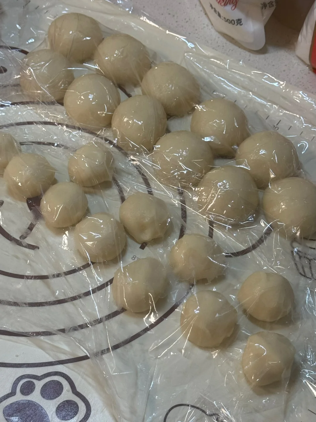 1.玫瑰酱挤干水,没有挤干水分 烤的时候可能会爆汁,挤干水分的内馅250g 加入低筋面粉、玉米油搅拌均匀团圆后均分成份份放入冰箱冷冻备用。