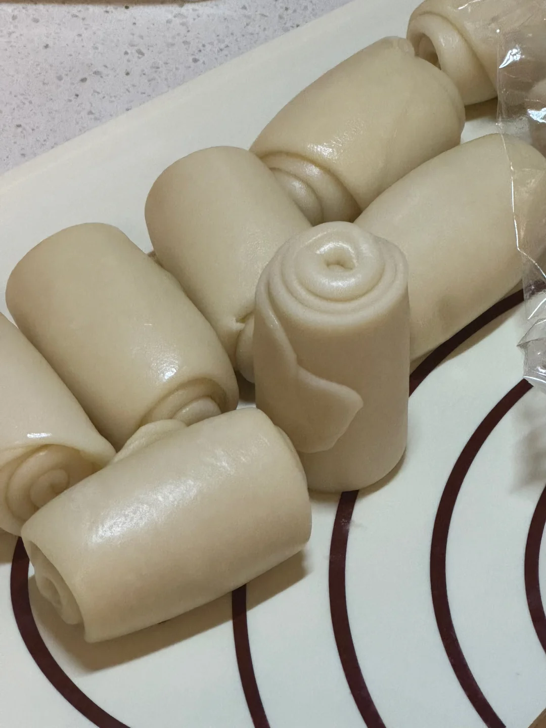2.油皮、油酥均分成12份,盖上保鲜膜松弛15分钟,油皮包入油酥,再继续松弛15分钟(天气热可以放冰箱冷藏松弛)进行第一次开酥,上次擀(不要太用力)从下往上卷起,依次卷起,盖上保鲜膜松弛15分钟,再进行二次开酥,这次要擀得更薄更长一些,从下往上卷起,卷紧一点,盖上保鲜膜松弛15分钟,取出一个,左右往里收,然后擀大一些包入玫瑰馅料,虎口收紧,收口处一定要捏紧,放入烤盘,表面可以用红丝绒液兑水,用筷子点几点会更好看。
