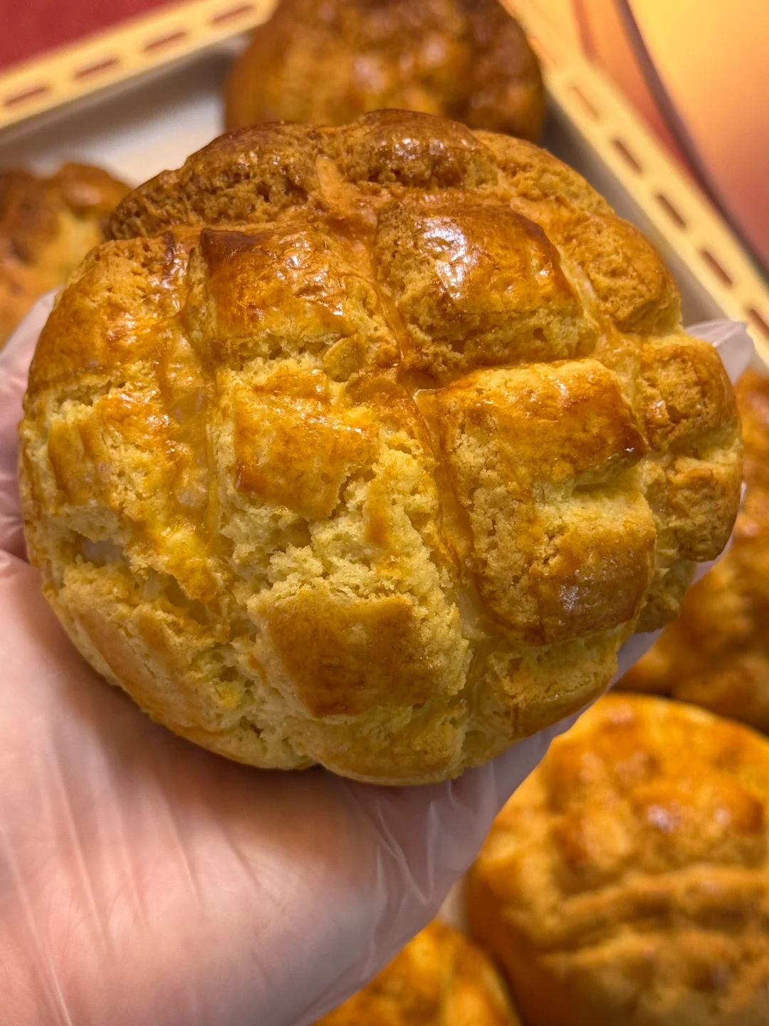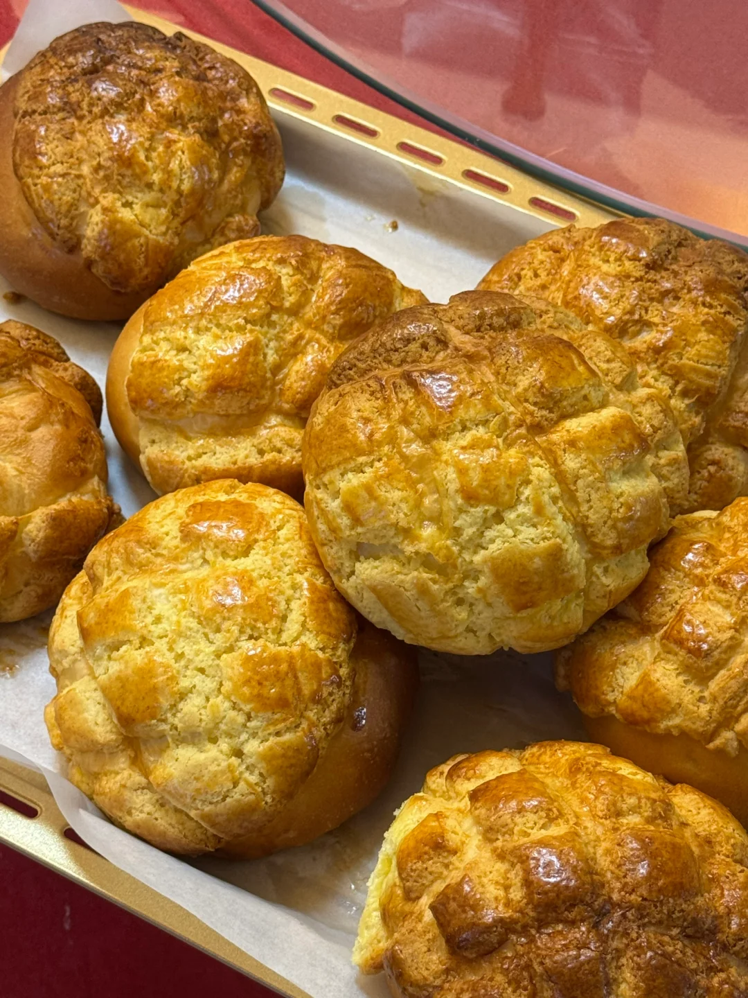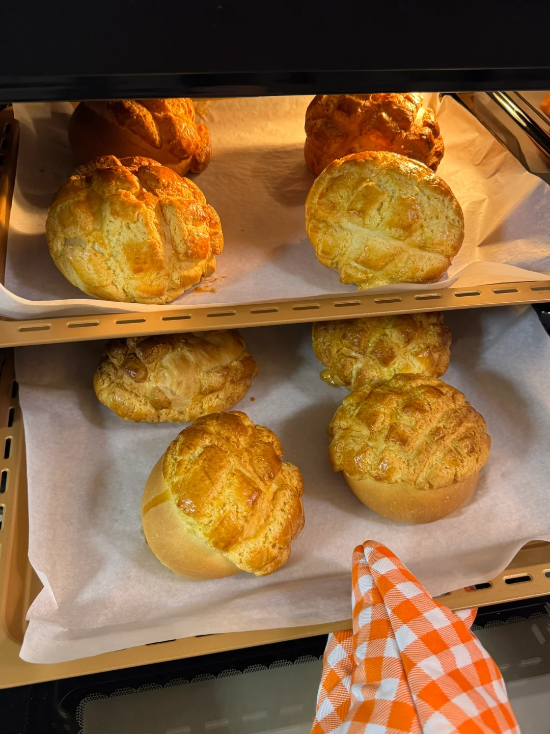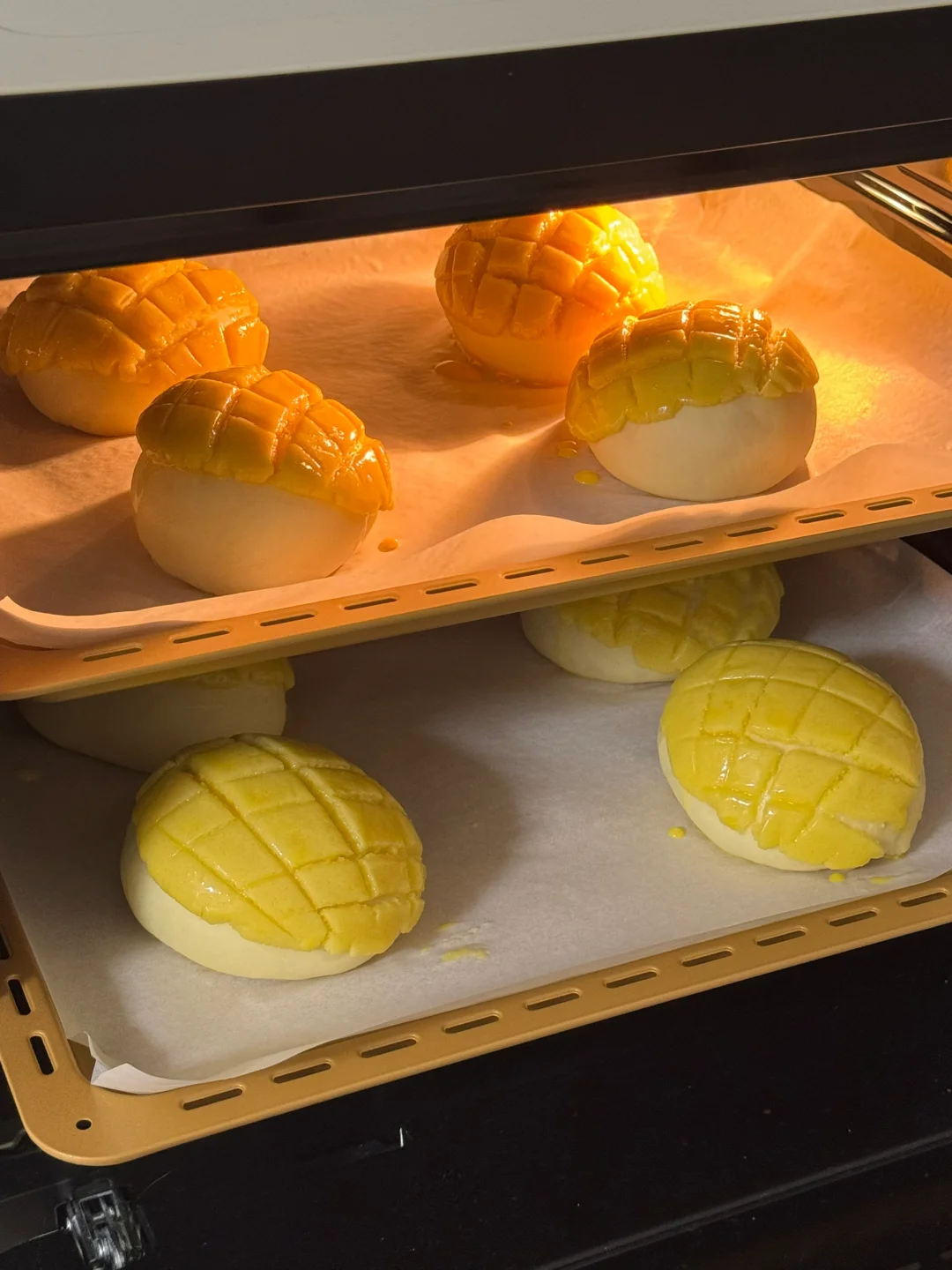 🌷金灿灿的菠萝包出炉啦,空气中弥漫着香味,外皮好酥脆,都酥到掉渣啦!!!里面的面包体很柔软细腻,菠萝包的灵魂在于这层酥皮,有空气炸锅的也可以去试试哦[哇R][哇R][哇R]