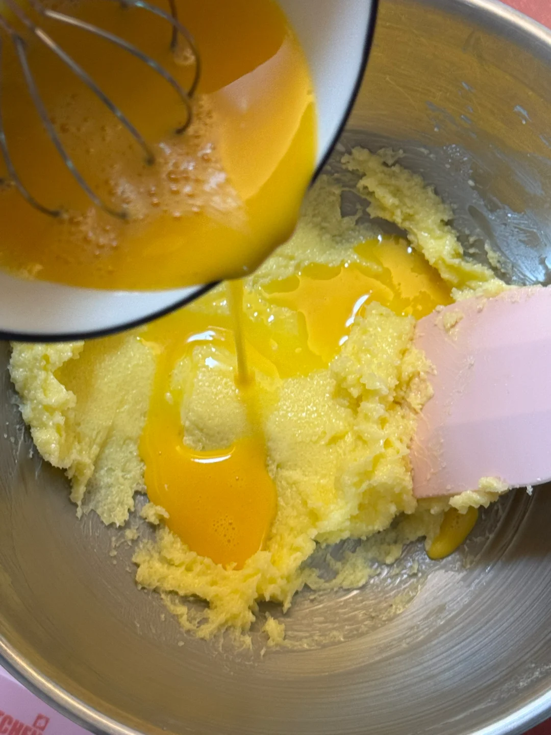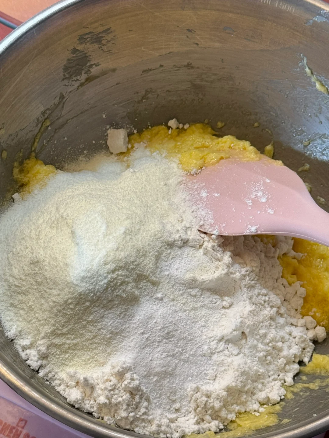 🌷酥皮部分:黄油软化加入细砂糖翻拌均匀,倒入鸡蛋液搅拌均匀,倒入低筋面粉、奶粉、泡打粉翻拌均匀,揉成团,均分成8份,揉圆放冷藏备用。