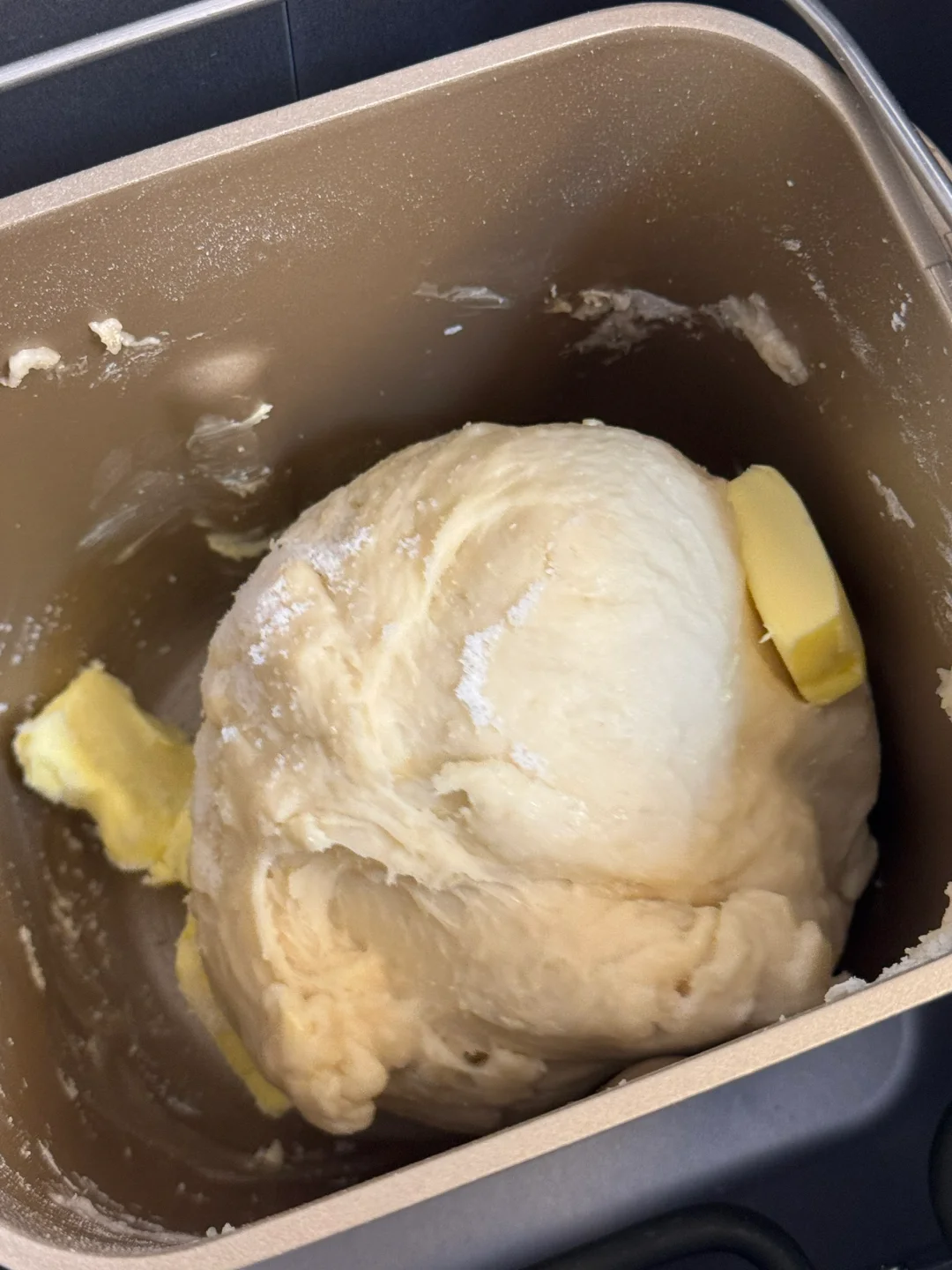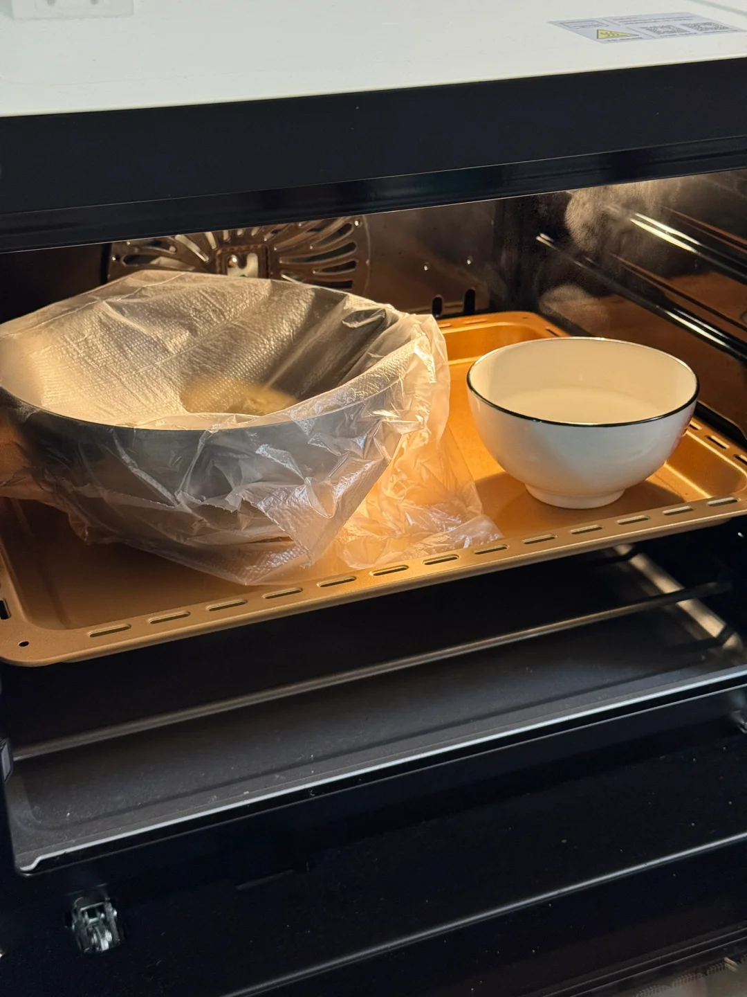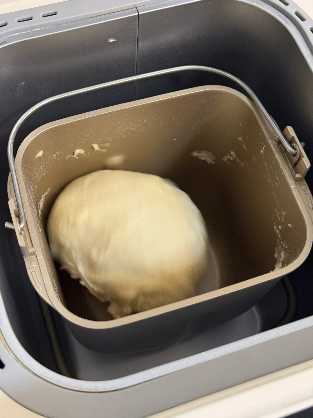 1.除黄油、盐以外的食材全部放入面包机中揉出厚膜,再加入黄油、盐揉出手套膜,盖上保鲜膜,放入烤箱28度发酵1小时(旁边放一碗热水,增加湿度)