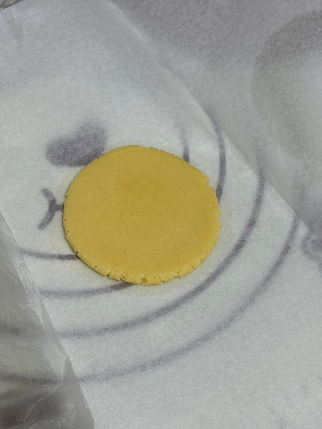 3.取出酥皮,准备一张油纸和一个扁的模具,把酥皮放在油纸上,用模具按压下去,把它按扁,将面团的顶部放在上面,翻过来揭掉油纸,用酥皮包住面团,再拿刮刀割出菠萝纹,割好之后放在铺有油纸的烤盘上,放入烤箱进行二次发酵,35度发酵40分钟。