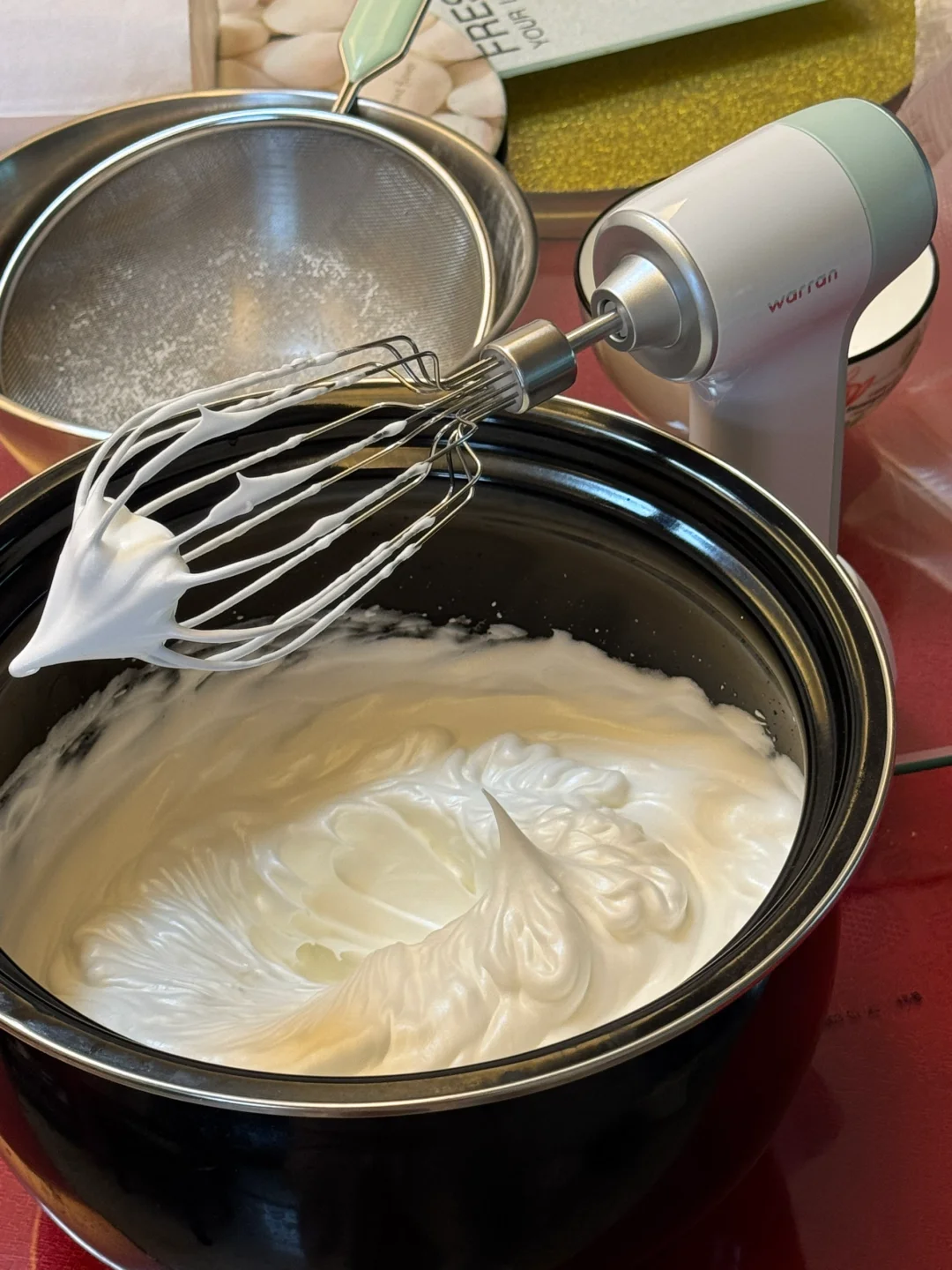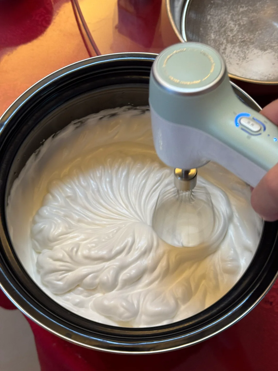 4.蛋清加入柠檬汁、细砂糖打发至小弯钩的状态。