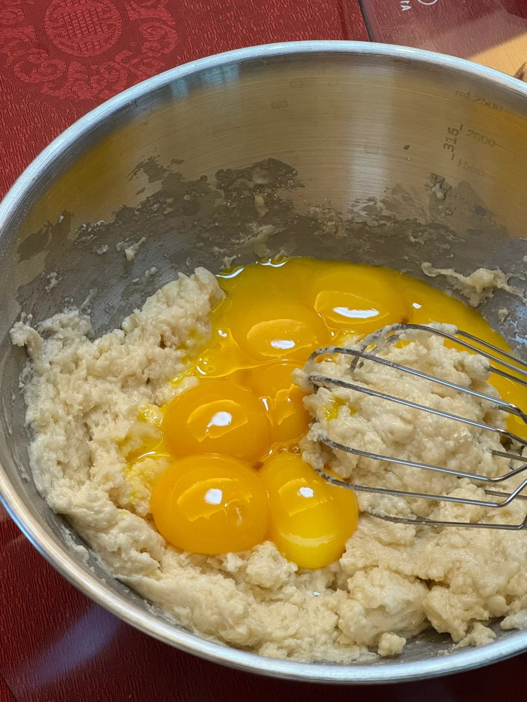 2.过筛低筋面粉、玉米淀粉搅拌至无干粉,倒入8颗蛋黄,Z字型搅拌至顺滑。