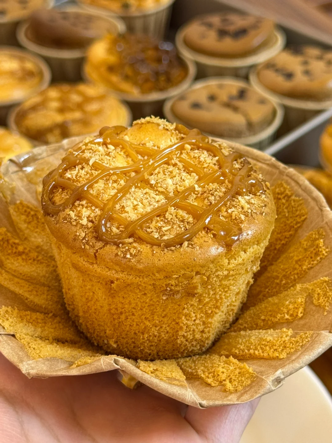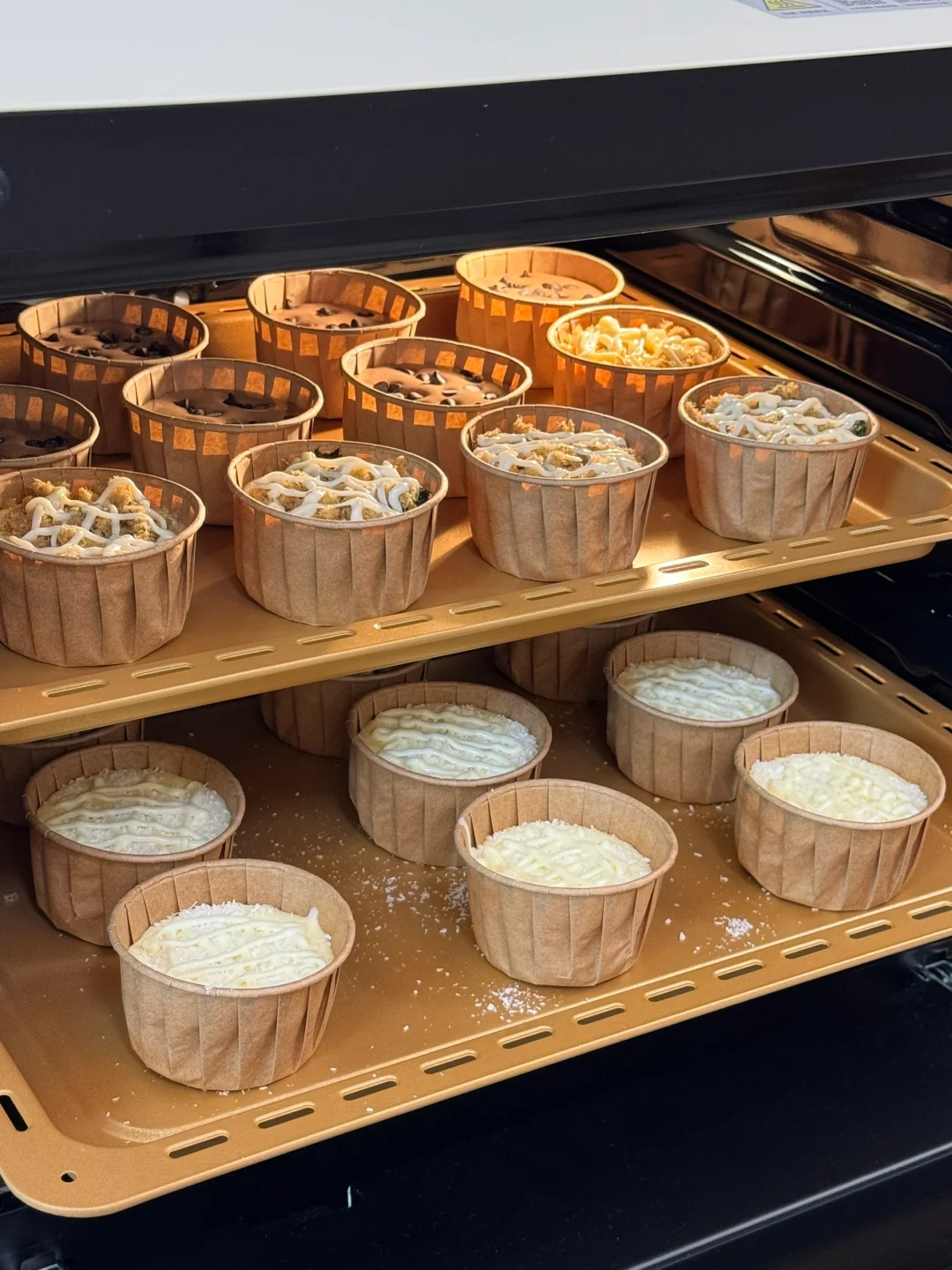 7.蛋糕糊装入裱花袋中,挤入纸杯八分满(用竹签划出气泡)可可味的表面撒耐高温巧克力豆,原味蛋糕糊一部分撒海苔肉松,另一部分撒椰蓉,再挤上沙拉酱。