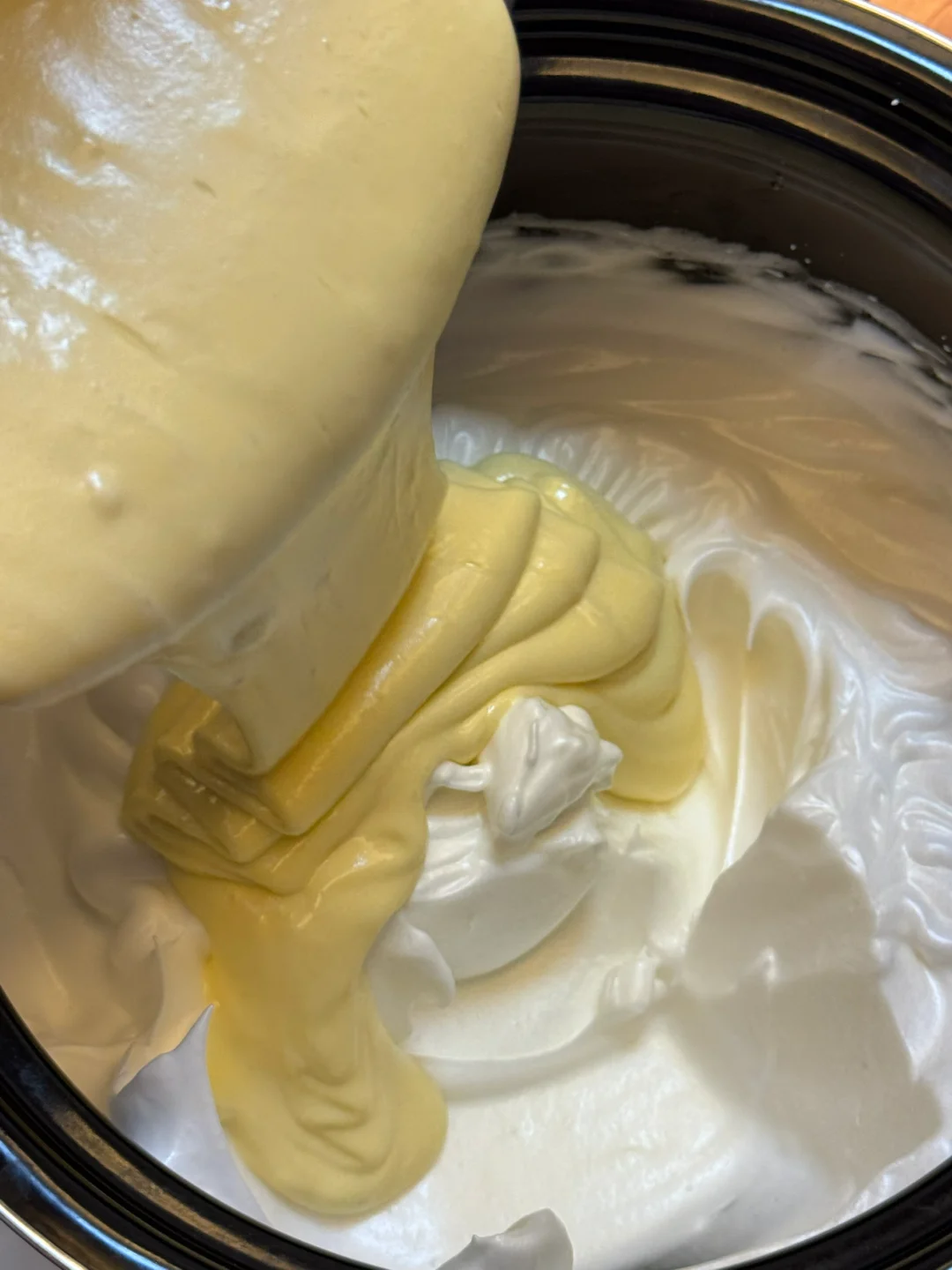 5.先取少量蛋白霜到蛋黄糊中翻拌均匀,再倒回蛋白霜中翻拌继续翻拌。