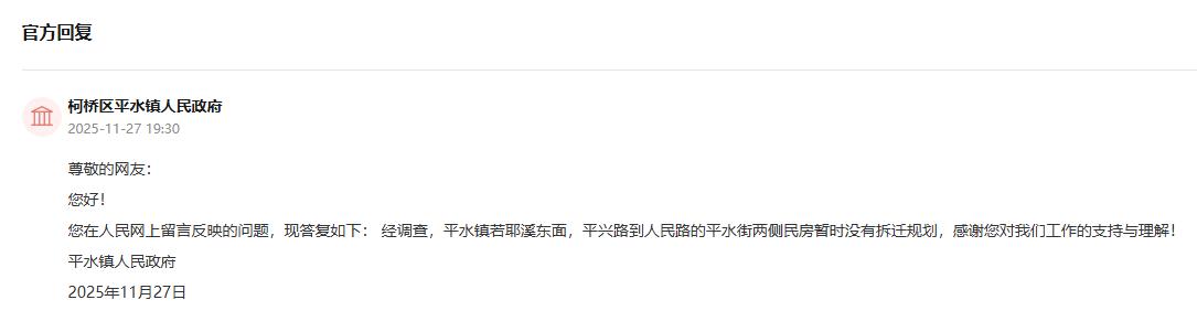 答:经调查,平水镇若耶溪东面,平兴路到人民路的平水街两侧民房暂时没有拆迁规划,感谢您对我们工作的支持与理解!