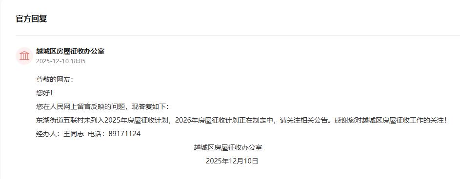 答:东湖街道五联村未列入2025年房屋征收计划,2026年房屋征收计划正在制定中,请关注相关公告。感谢您对越城区房屋征收工作的关注!