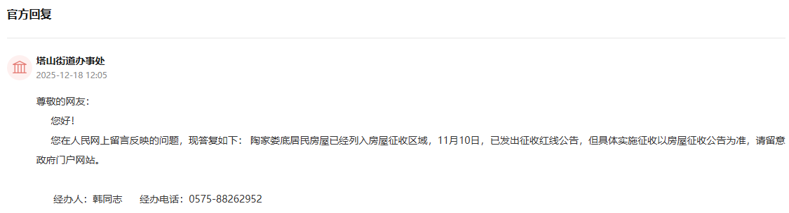 答:陶家娄底居民房屋已经列入房屋征收区域,11月10日,已发出征收红线公告,但具体实施征收以房屋征收公告为准,请留意政府门户网站。