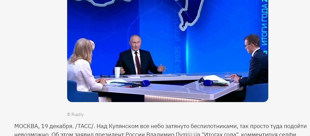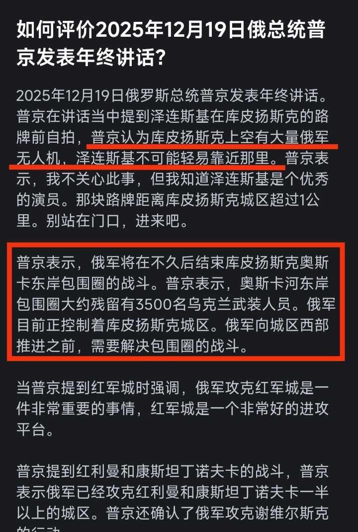 如何评价2025年12月19日俄总统普京发表年终讲话? 2025年12月19日俄罗斯总统普京发表年终讲话。普京在讲话当中提到泽连斯基在库皮扬斯克的路牌前自拍,普京认为库皮扬斯克上空有大量俄军无人机,泽连斯基不可能轻易靠近那里。普京表示,我不关心此事,但我知道泽连斯基是个优秀的演员。那块路牌距离库皮扬斯克城区超过1公里。别站在门口,进来吧。 普京表示,俄军将在不久后结束库皮扬斯克奥斯卡东岸包围圈的战斗。普京表示,奥斯卡河东岸包围圈大约残留有3500名乌克兰武装人员。俄军目前正控制着库皮扬斯克城区。俄军向城区西部推进之前,需要解决包围圈的战斗。 当普京提到红军城时强调,俄军攻克红军城是一件非常重要的事情,红军城是一个非常好的进攻平台。 普京提到红利曼和康斯坦丁诺夫卡的战斗,普京表示俄军已经攻克红利曼和康斯坦丁诺夫卡一半以上的城区。普京还确认了俄军攻克谢维尔斯克的行动。 ------------------------------------ 那你自己去走一趟不就完了嘛