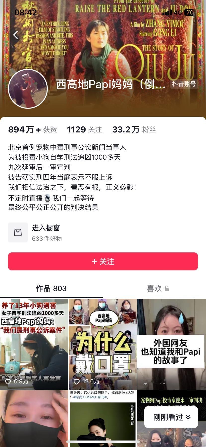 北京李女士真实身份曝光某自媒体账号粉丝33万之多,橱窗里摆着600多件琳琅满目的商品,全部都是宠物的用品,李女士为何把一条狗的事情闹得沸沸扬扬,唯恐天下不知,到处宣扬?她的用意何在? 坚持三年也要把张老汉送进去,最终心愿达成,但是收到一审判决判张老汉4年刑期,李女士不满意又联合其他10名宠物狗的主人对一审判决提出抗诉,但最终法院没有支持。 正常人的遇到这事法院能判张老汉4年肯定已经满足了,毕竟这是中国首例因为毒害宠物狗被判刑的案件,之前的类似案例都是经济赔偿。但李女士仍然不满意还要继续抗诉争取按照最高量刑判张老汉10年以上,对于一个65岁身患恶性肿瘤的老人如此残忍令人想不到! 李女士难道一点问题都没有吗? 李女士在遛狗时如果牵狗绳,狗能吃到外面的东西吗?可以肯定狗没有栓绳而且放开的撒欢。 李女士也违反了文明养犬的条例,自己有错还对着张老汉追着不放,她的目的只有一个! 李女士借着爱狗之名,把事情搞热,以受害人的身份赢得爱狗人士的同情,收获更多的粉丝,这才是她最终目的。 她为什么不想这场官司尽快解决,还要揪着不放,想把时间延长,她就是要继续保持热点,让更多人关注她,粉丝越多她越开心。 她拥有众多粉丝而且大部分是宠物爱好者,对她的遭遇比较同情,李女士直播卖货才会得到更多人的支持,赚钱才是最终目的。没了热点就不好收割粉丝了。 她不止一个账号,众多自媒体平台有很多账号,累积粉丝肯定也不少,宠物用品都很暴利,赚钱更容易,滚滚财源谁都不会拒之门外。三年间辞掉工作还能这么精致的生活,经济来源靠什么?大家都很明白!