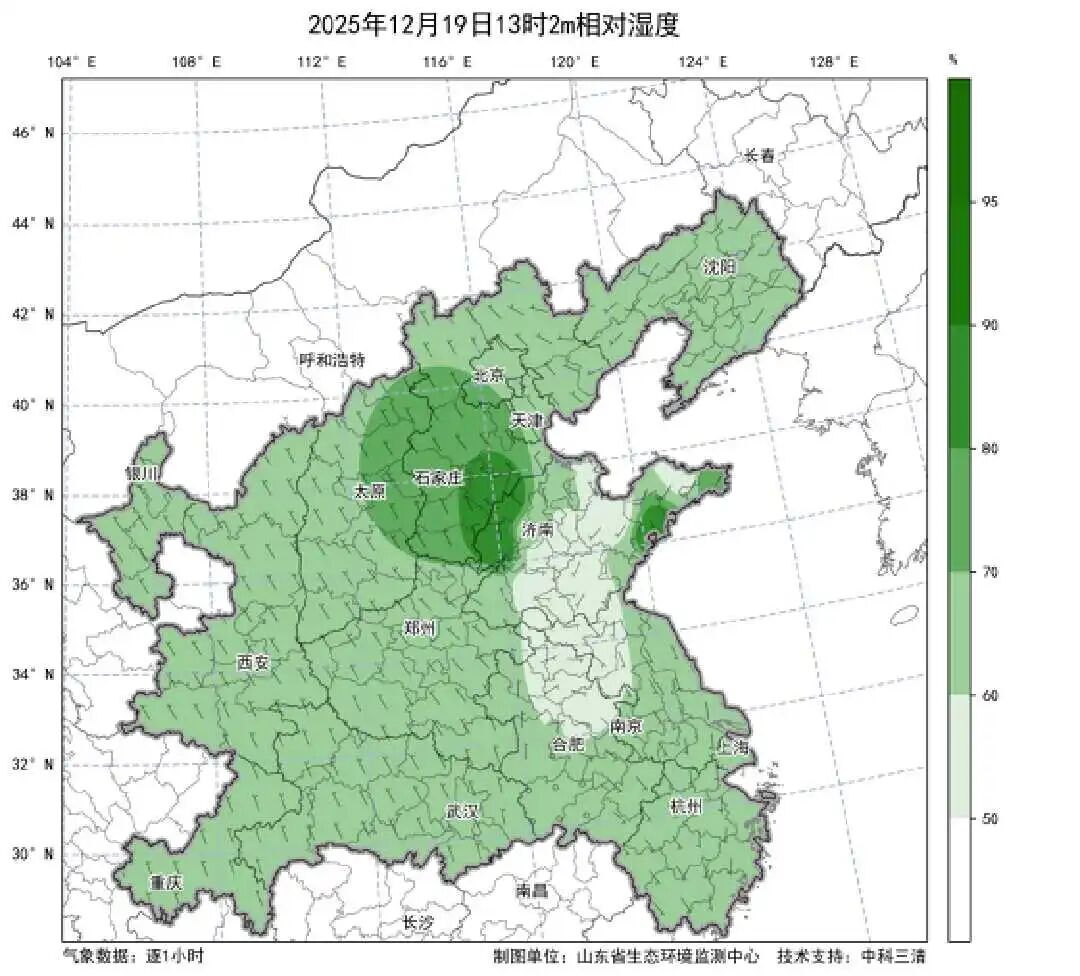 近期不利扩散条件推动了区域性污染的形成。目前,区域处于冬季采暖季,易形成偏不利的大气扩散条件。12-13日出现大范围降雪,伴随后续气温不断攀升,积雪融化,导致近地面相对湿度较大。区域地面形势场较弱,中层持续回温,早间有逆温;水平方向上,夜间至早上高湿静稳,出现大范围雾区,高湿条件下气态污染物易发生二次转化,造成区域上PM2.5浓度整体持续升高。18日夜间济南市近地面偏东南风转为偏南风,风场较弱,相对湿度较大,19日白天受弱冷空气影响,整体扩散条件转差,同时叠加上游污染传输,导致空气质量恶化,当前空气质量达到中度污染水平。