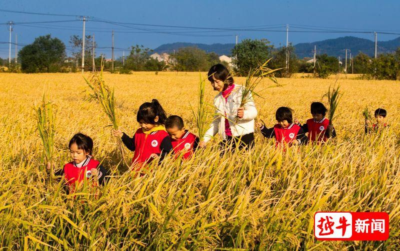 上虞区驿亭镇中心幼儿园把劳动教育课堂“搬进”稻田里,孩子们在老师的带领下体验割稻、捡拾稻穗。朱胜均/摄