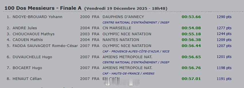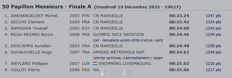 17e Meeting National des Hortillons 第一天决赛男50自:Maxime Grousset 21.51 PB男100仰:Yohann Ndoye-Brouard 53.66男50蝶:Michel Arkhangelsky 23.24