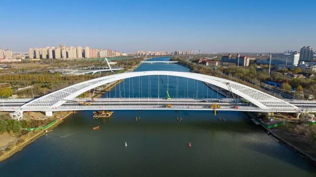 柳悦桥由中交投资牵头的中交联合体与天津城投集团共同建设,中交公规院负责设计,中交一航局承担施工任务。建设团队以科学组织与技术创新双轮驱动,打破传统设计范式,通过一跨过河的方案留存海河两岸原生景观;创新构建复合拱结构体系,实现结构美学与工程力学的平衡,打造出兼具硬核工程价值与人文温度的城市新地标。