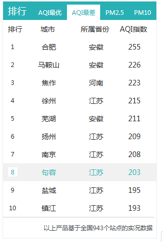 排在第二位的为马鞍山,AQI指数为226。在前十榜上还有一个安徽站点芜湖,AQI指数211排在第五位。