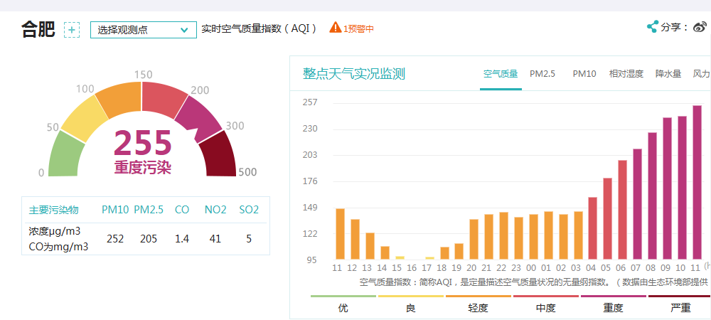7时,合肥市AQI指数越过200重度污染线,达到了210。随后,合肥市AQI指数维持在重度污染区间。11时,合肥市AQI指数为255,在全国空气质量最差榜上排在第一位。