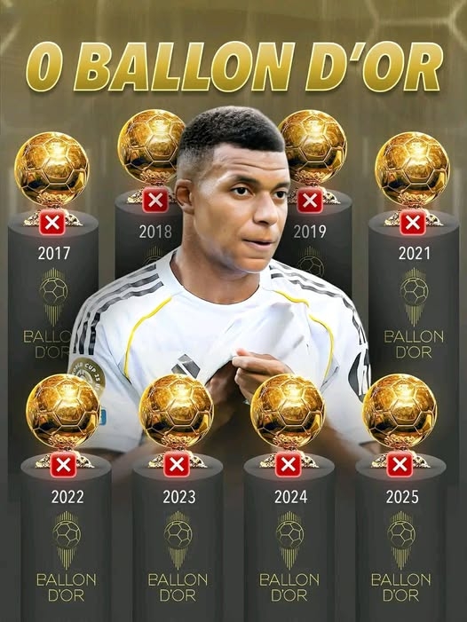 2025年的金球奖和FIFA年度最佳都已结束评选,两大个人奖项姆巴佩依旧无缘,金球排名第7、FIFA年度最佳排名第3。