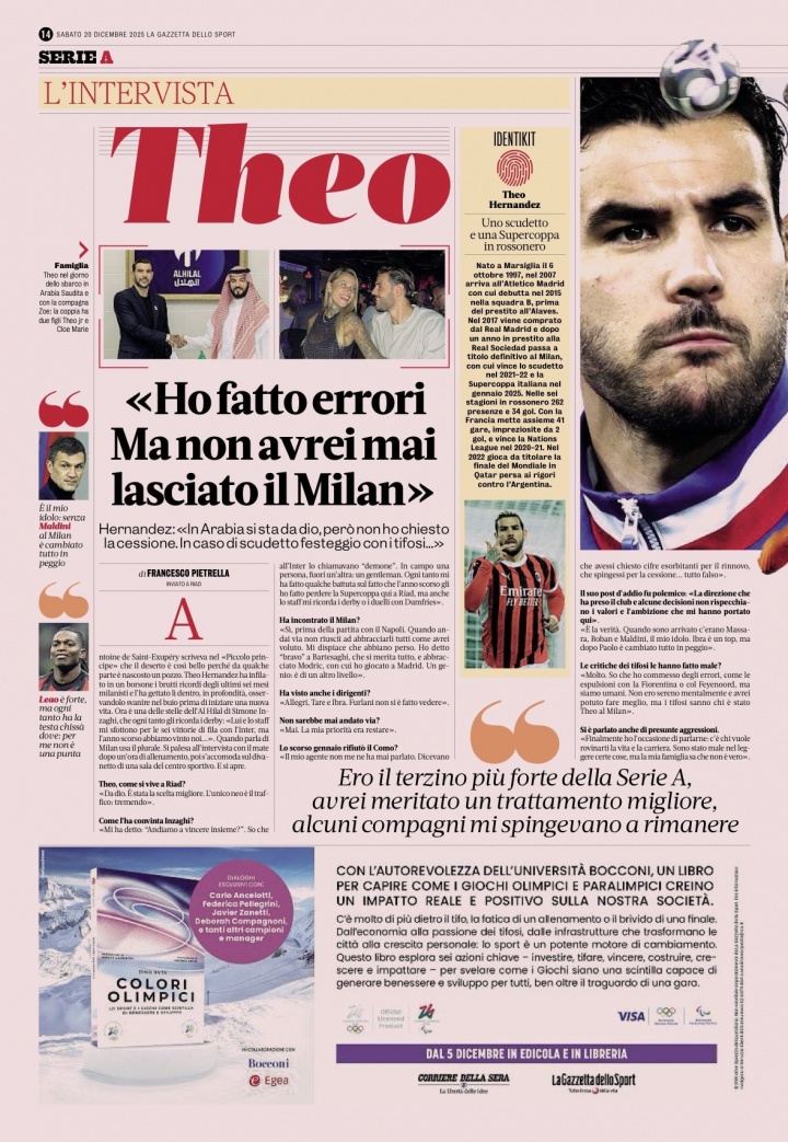 你离开很令我难过,本以为你会一直留在米兰。我一直认为并不全是你的错,因为管理层自己都乱得一团糟,从教练选择到球员引进再到球员管理无不如此。对于特奥只有祝福,就像对卡拉布里亚、托纳利一样。希望你在沙特一切顺利!