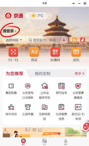 打开微信/支付宝,搜索“京通”小程序进入。点击左上角[请登录]按钮,按提示录入个人信息,完成[人脸识别]验证。