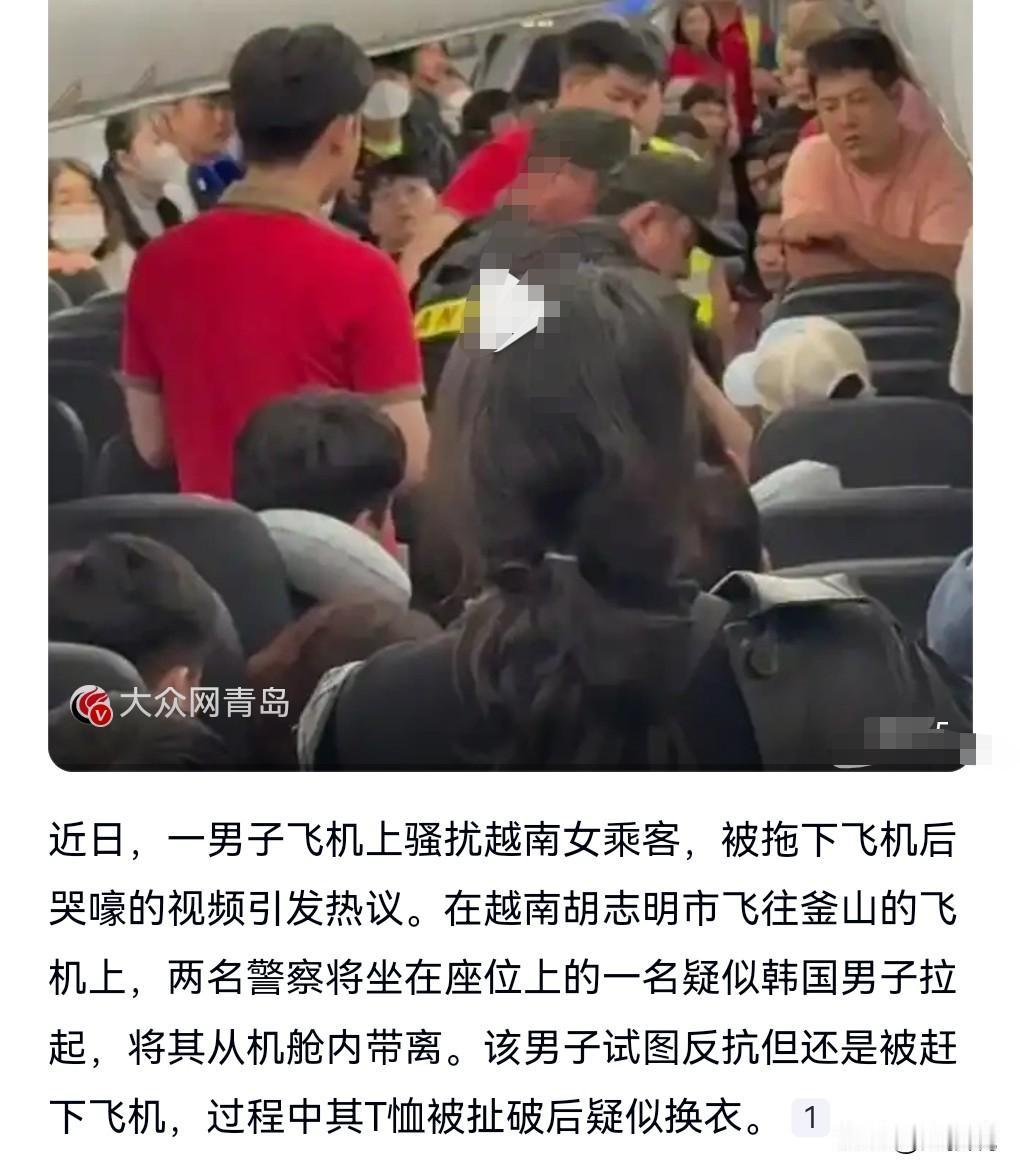 这真是丢人丢到了全球啊。 近日,韩国男子疑骚扰女乘客被拖下飞机。 这真的是无法无天啊,竟然在飞机上多次骚扰越南女子。 男子的衣服都被别人扯破了,后来还换了衣服,衣服上有个韩国国旗的标志。 被赶下飞机后,他竟然嚎啕大哭。 这对他还是客气的啦,如果是在我国,骚扰女人可能要被拘留的。