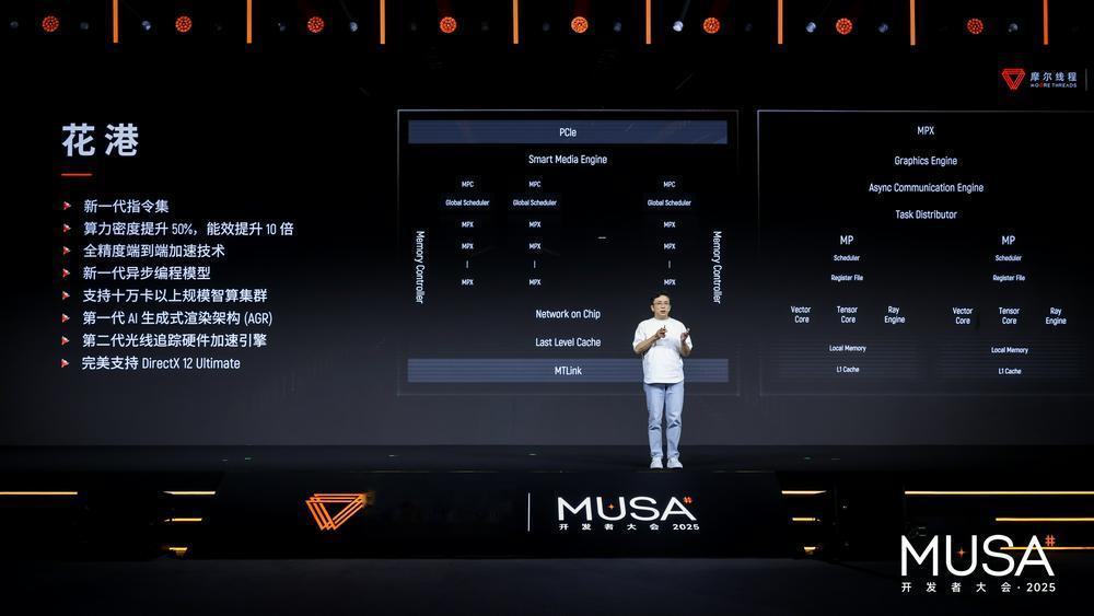 摩尔线程创始人、董事长兼CEO张建中介绍,新发布的GPU架构“花港”,基于新一代指令集,算力密度提升50%;支持从FP4到FP64的全精度端到端计算,新增MTFP6/MTFP4及混合低精度支持。集成新一代异步编程模型,优化任务调度与并行机制;通过自研MTLink高速互联技术,支持十万卡以上规模智算集群扩展。