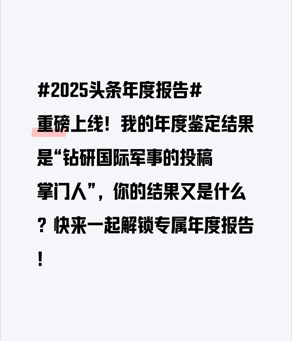 2025头条年度报告上线啦,我拿到“钻研国际军事的投稿掌门人”这个鉴定结果,还挺意外的。平时我就喜欢研究国际军事,看到啥新消息、新动态,就忍不住写出来投稿。像某某国家又研发了新型武器,或者某场军事演习有啥亮点,我都会仔细分析,然后分享到头条上。这一年在头条上分享了好多军事相关的内容,没想到得到这么个有趣的称号。不知道大家的年度鉴定结果都是啥,是“知识科普小能手”,还是“娱乐八卦洞察家”?赶紧去解锁自己的专属年度报告吧!