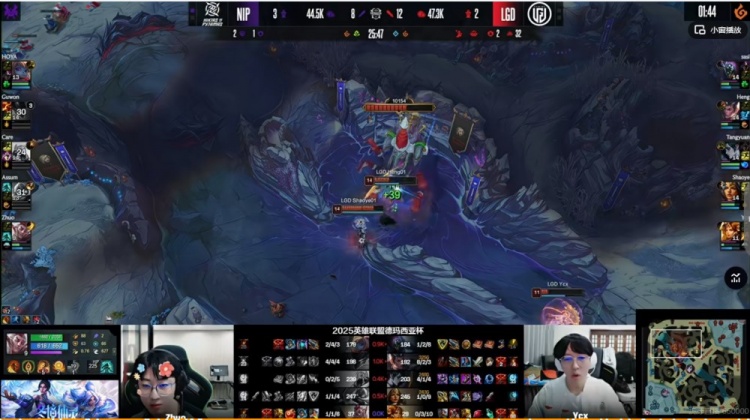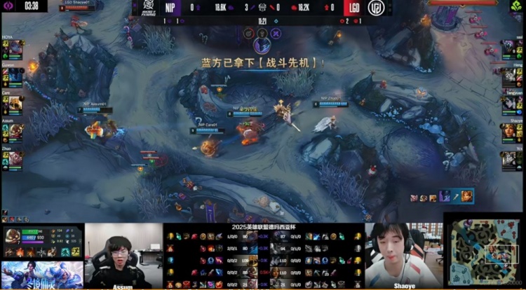 [15:40]先锋团,Zhuo洛闪现开三个,但是后面的Tangyuan彗没人管了输出拉满!Heng赵信开大进场被Care沙皇推回!这波双方最终是3换3,Tangyuan彗双杀!随后LGD拿下小龙,NIP拿下先锋,Guwon梦魇关灯强开自己白给!这波LGD又打出1换2!