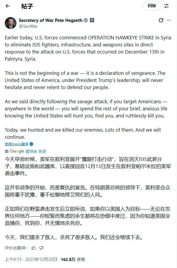 美军一口气发射百枚导弹,是复仇还是作秀? 12月19日,美国防长赫格塞思在社交媒体上宣布,当天美军对叙利亚境内对恐怖组织“伊斯兰国”(ISIS)发起空袭,以回应前段时间美军士兵遇袭事件。美军用超100枚导弹空袭“伊斯兰国” 根据媒体报道,当天美军共计发射了超过100枚精确制导导弹,打击了叙利亚中部代尔祖尔、拉卡等地的70多个目标,重点摧毁“伊斯兰国”的基础设施和武器库。MCN双量进阶计划 对此,赫格塞思在声明中强调此举是“复仇宣言”,渲染“如果你以美国人为目标……美国会追捕你、找到你,并毫不留情地杀死你”——颇有“犯我强美者,虽远必诛”的意味。 美军发动此次空袭的起因显而易见:为12月13日叙利亚巴尔米拉市袭击中死亡的两名美军士兵报仇——虽然袭击者当时就已经被击毙,但特朗普政府仍将其归咎于ISIS,并威胁实施报复。 但事实上,如果特朗普真想报复回来,其实完全没必要折腾出这么大动静:ISIS在叙利亚然仍有余孽潜伏,但早已丧失昔日领土控制力,基本退化为散兵游勇和小股武装,远称不上成气候的威胁,也用不上美军如此规模火力急袭。 所以,美军这回一口气投下百余枚导弹,与其说是“精准复仇”,不如说是炫耀武力,顺便展示特朗普的强硬人设。