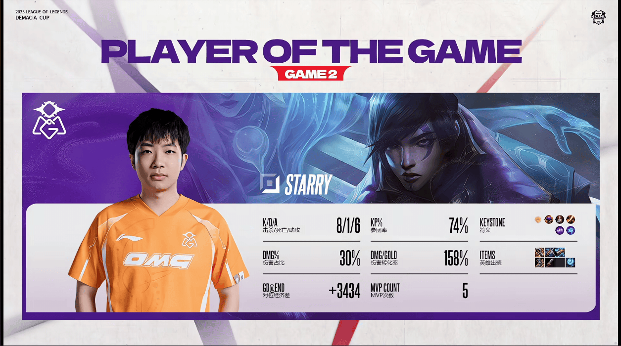 Starry厄斐琉斯打出8/1/6战绩,斩获OMG对阵WBG第二局MVP