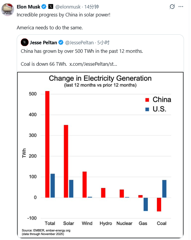 一位X用户分享独立能源智库EmberEnergy的一张图表称:“过去12个月里,中国的发电总量增加了超过500太瓦时(5000亿千瓦时)。其中,太阳能发电量增加了约350太瓦时,煤炭发电量减少了66太瓦时。”马斯克转发该帖子并评论称:“中国在太阳能发电领域取得了令人难以置信的进展!美国也需要采取同样的行动。”