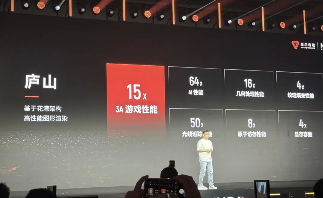 “庐山”专攻高性能图形渲染。其AI计算性能提升64倍,几何处理性能提升16倍,光线追踪性能提升50倍,并显著增强纹理填充、原子访存能力及显存容量。集成AI生成式渲染、UniTE统一渲染架构及全新硬件光追引擎,为3A游戏、高端图形创作提供强大算力支持。