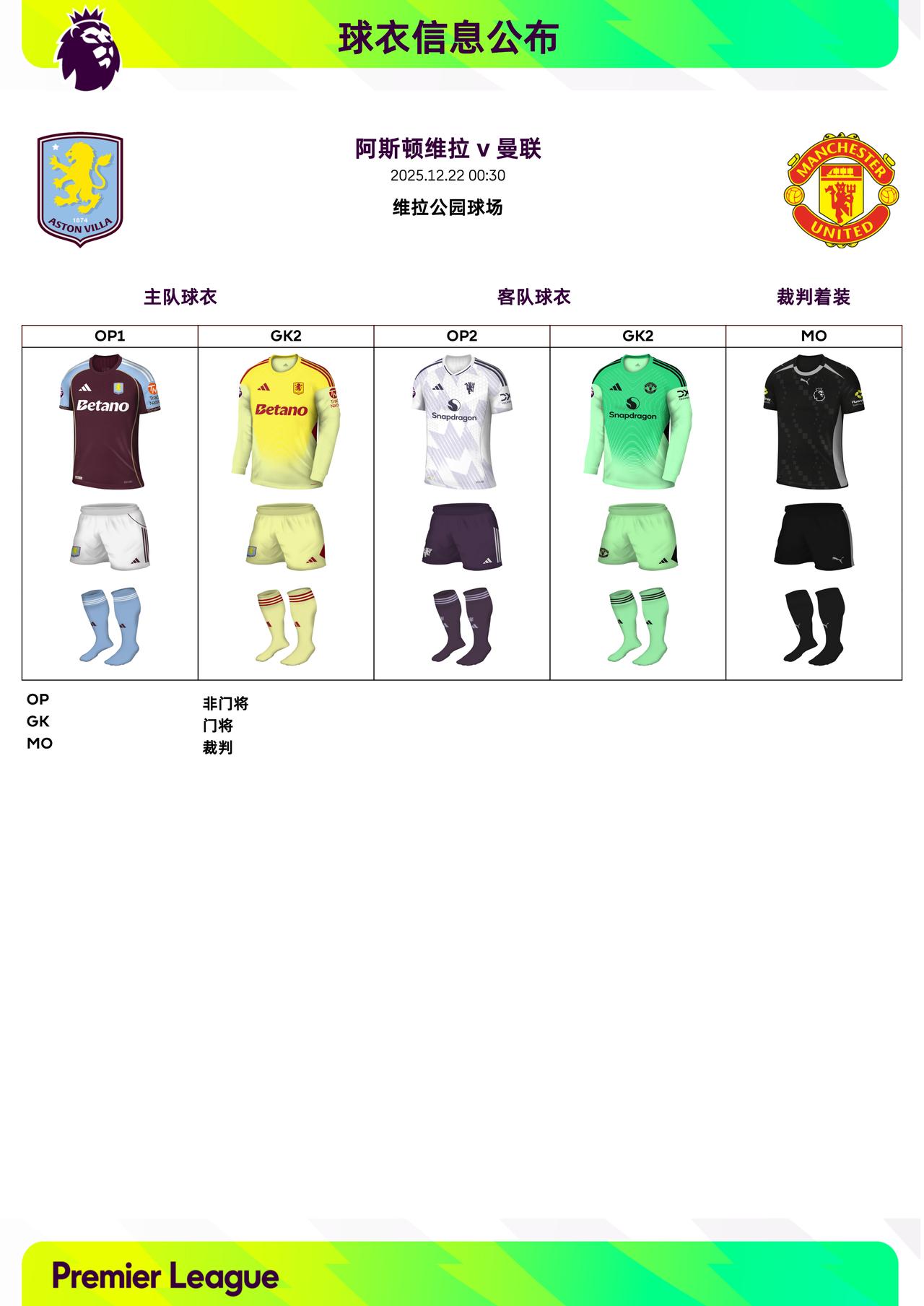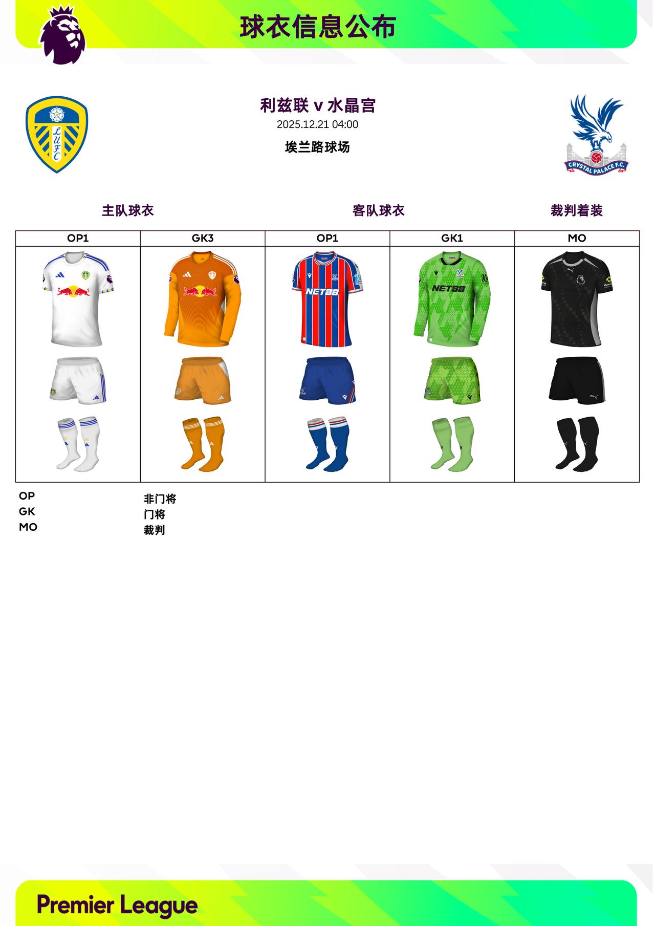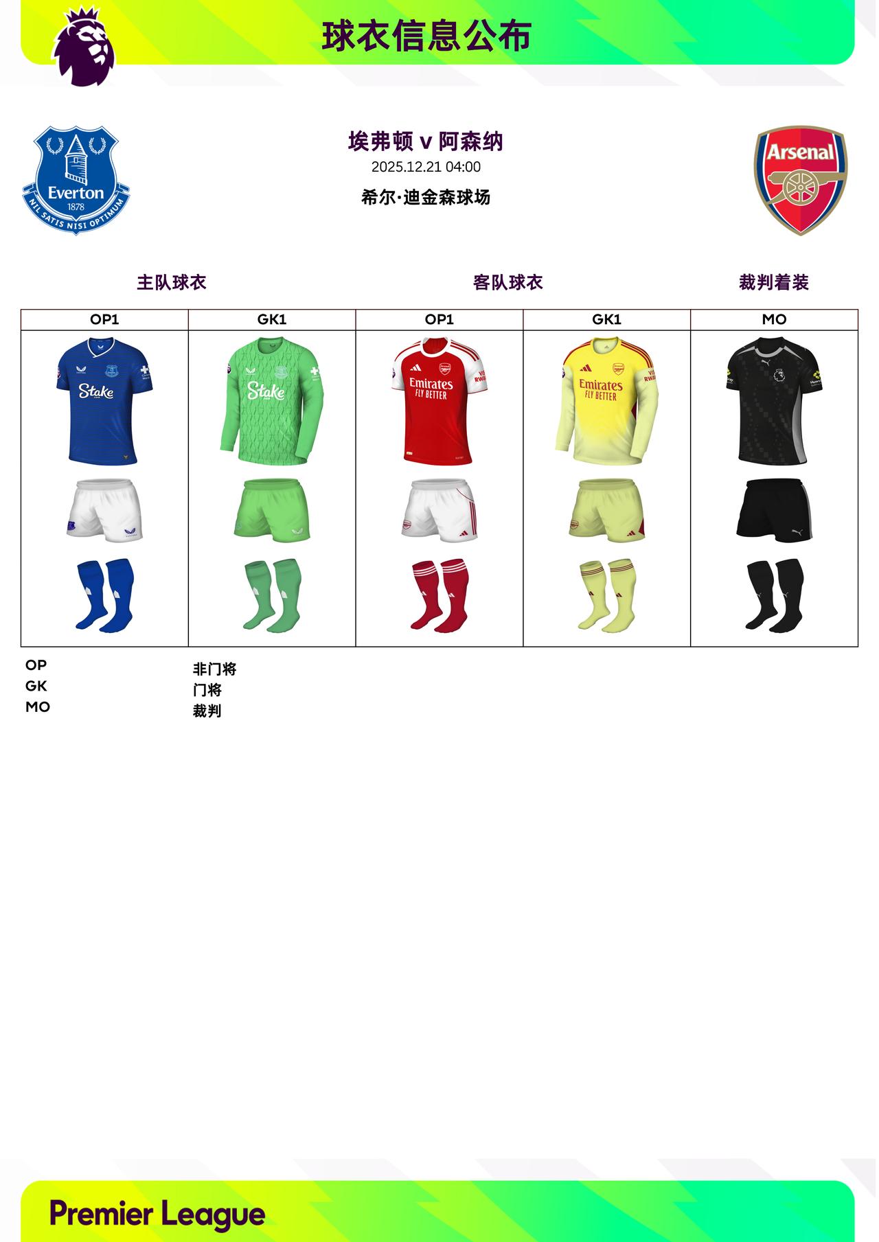 2025/26赛季英超联赛第17轮球衣信息: ◉ 焦点战——热刺 v 利物浦,“红军”身穿主场球衣