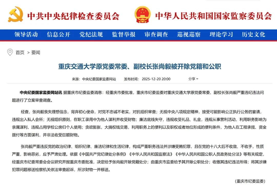 12月20日,中央纪委国家监委网站通报,据重庆市纪委监委消息:经重庆市委批准,重庆市纪委监委对重庆交通大学原党委常委、副校长张尚毅严重违纪违法问题进行了立案审查调查。