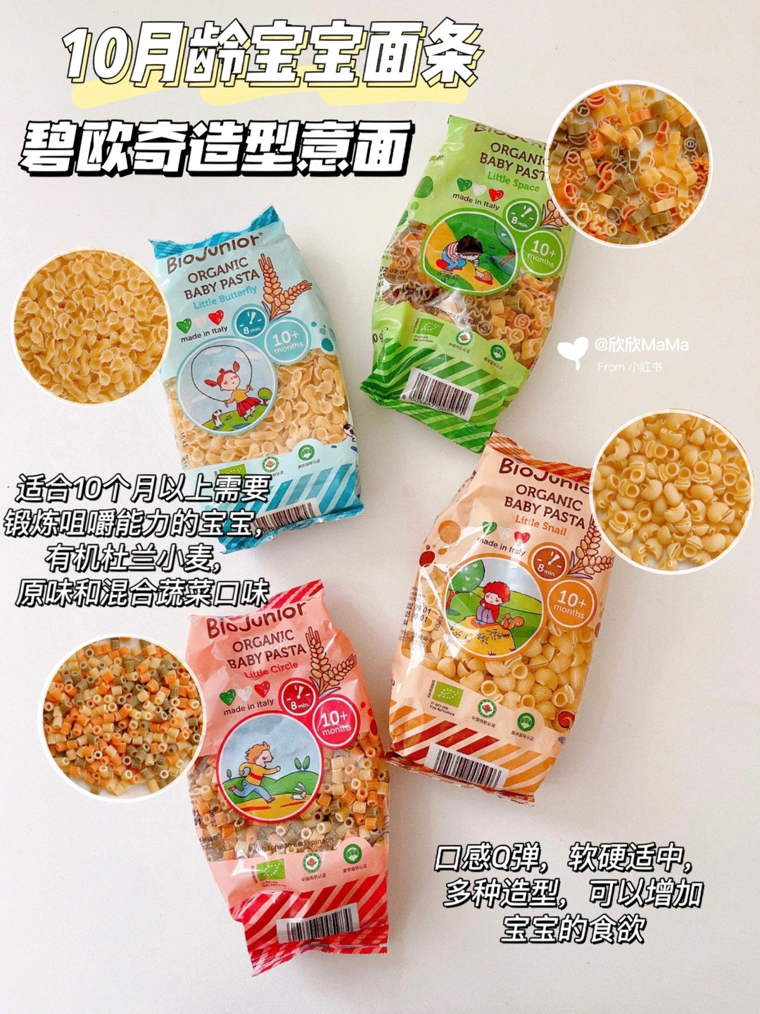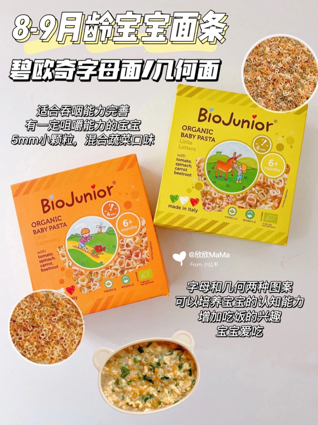 我家欣欣从碎碎面到造型面都是吃的碧欧奇家的,它家面条添加了维生素A、D、B1及钙铁锌,符合婴幼儿国家标准!粒粒面仅2mm大小,添加蔬菜等多种口味。1.2cm碎碎面易吞咽长度,2.5cm碎碎面容易咀嚼。辅食多样化后,给欣欣添加了字母面和几何面,它造型可爱,增加宝宝食欲,也是小小的一颗,好吞咽!造型面更是欣欣的心头好,可以做意面或者拌面都好吃。他家的面都是易煮不易坨,适合各种烹饪方法,更重要的是配料表干净不含盐,给宝宝吃起来也放心!