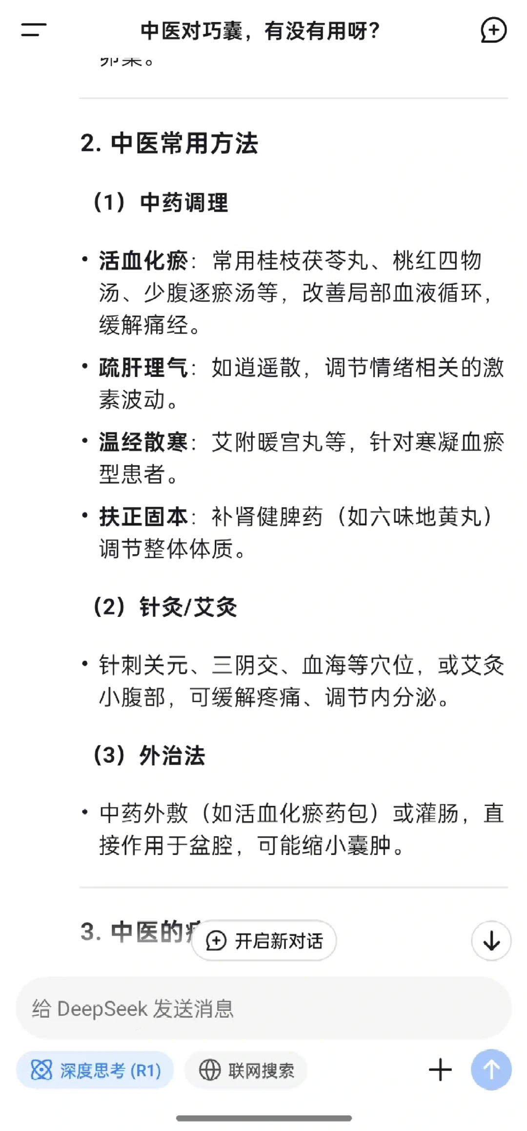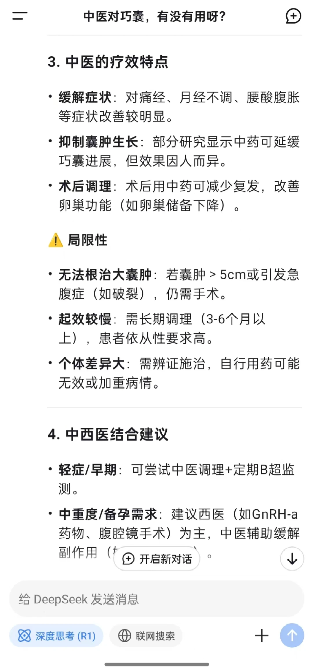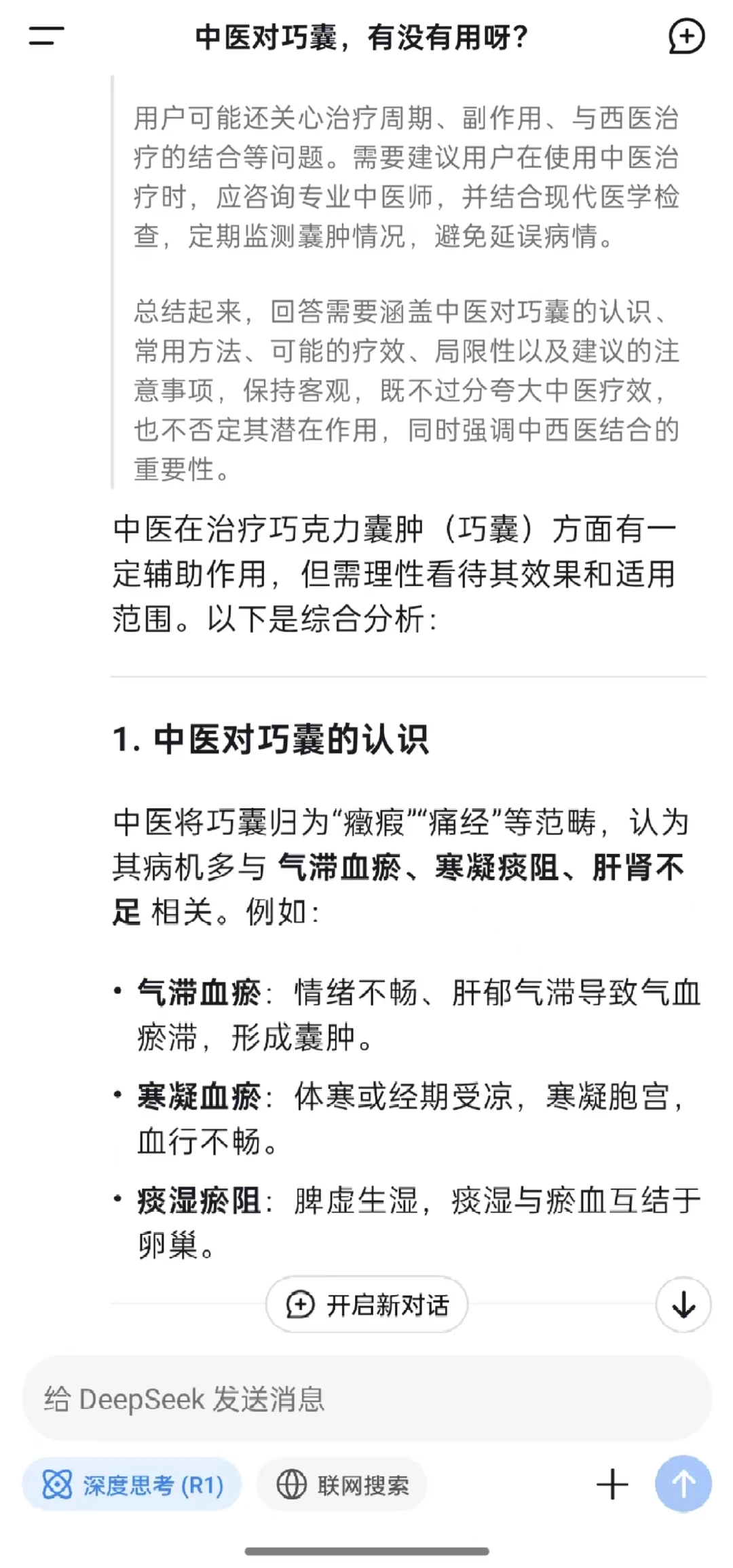 提问了下大家相对比较关心的“中医对巧囊有没有用”,发现它的回答条理清晰,既有思路,还有细节,基本的知识维度上,可以供大家参考。