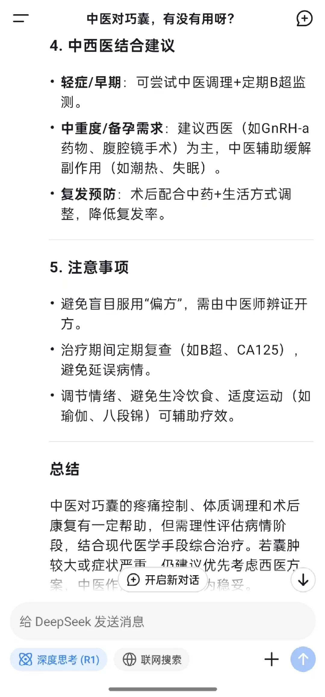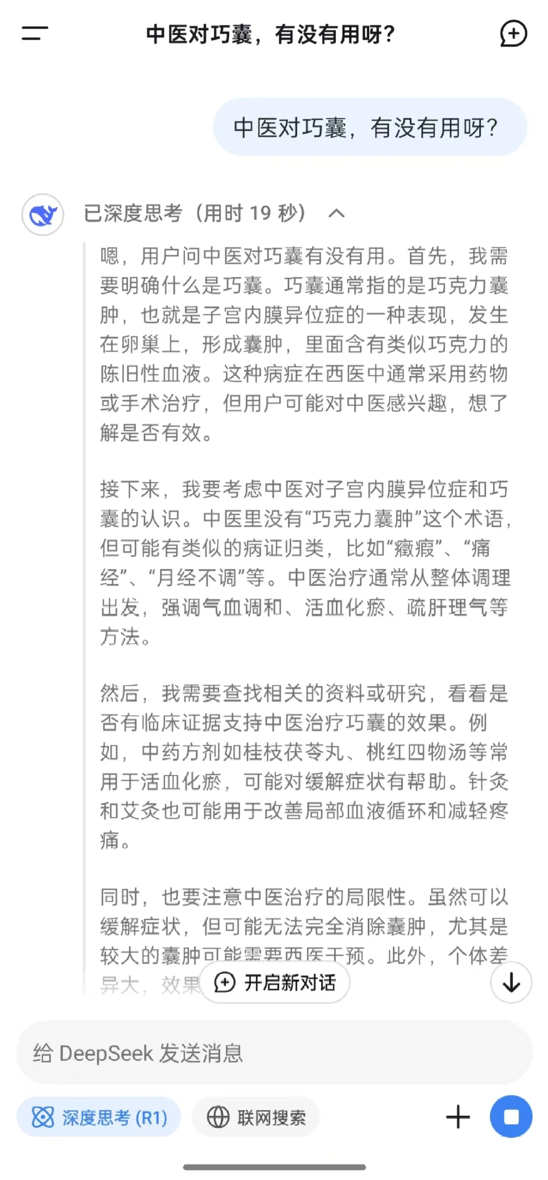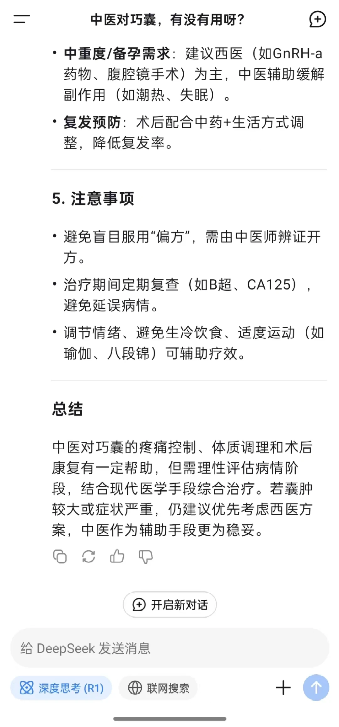 提问了下大家相对比较关心的“中医对巧囊有没有用”,发现它的回答条理清晰,既有思路,还有细节,基本的知识维度上,可以供大家参考。