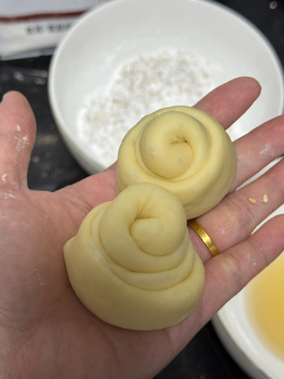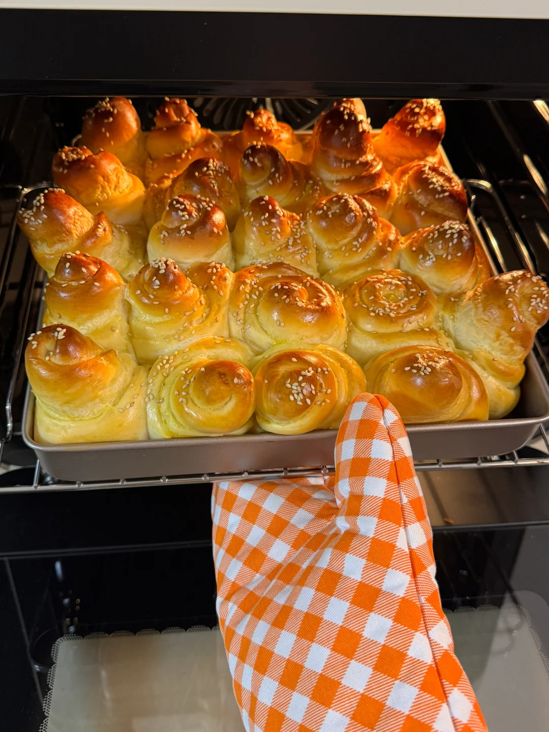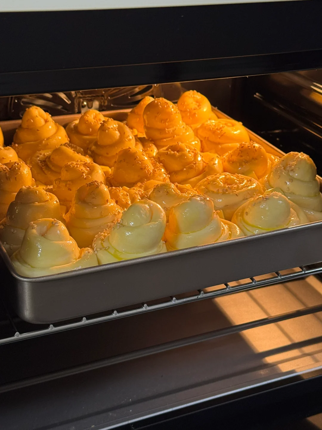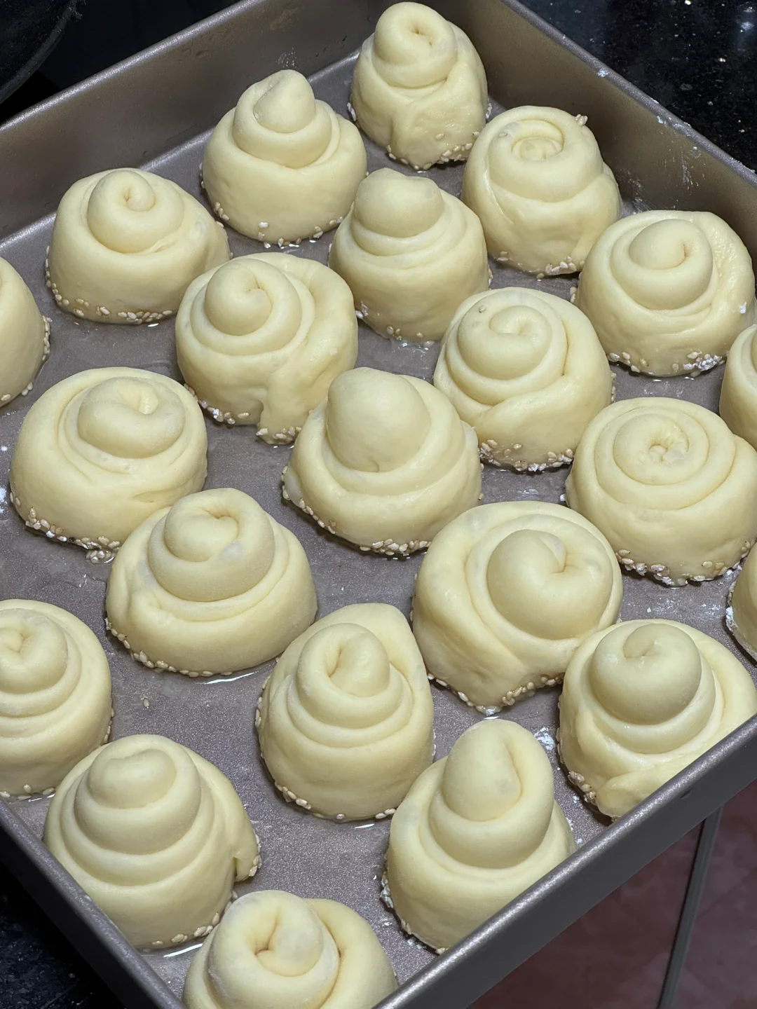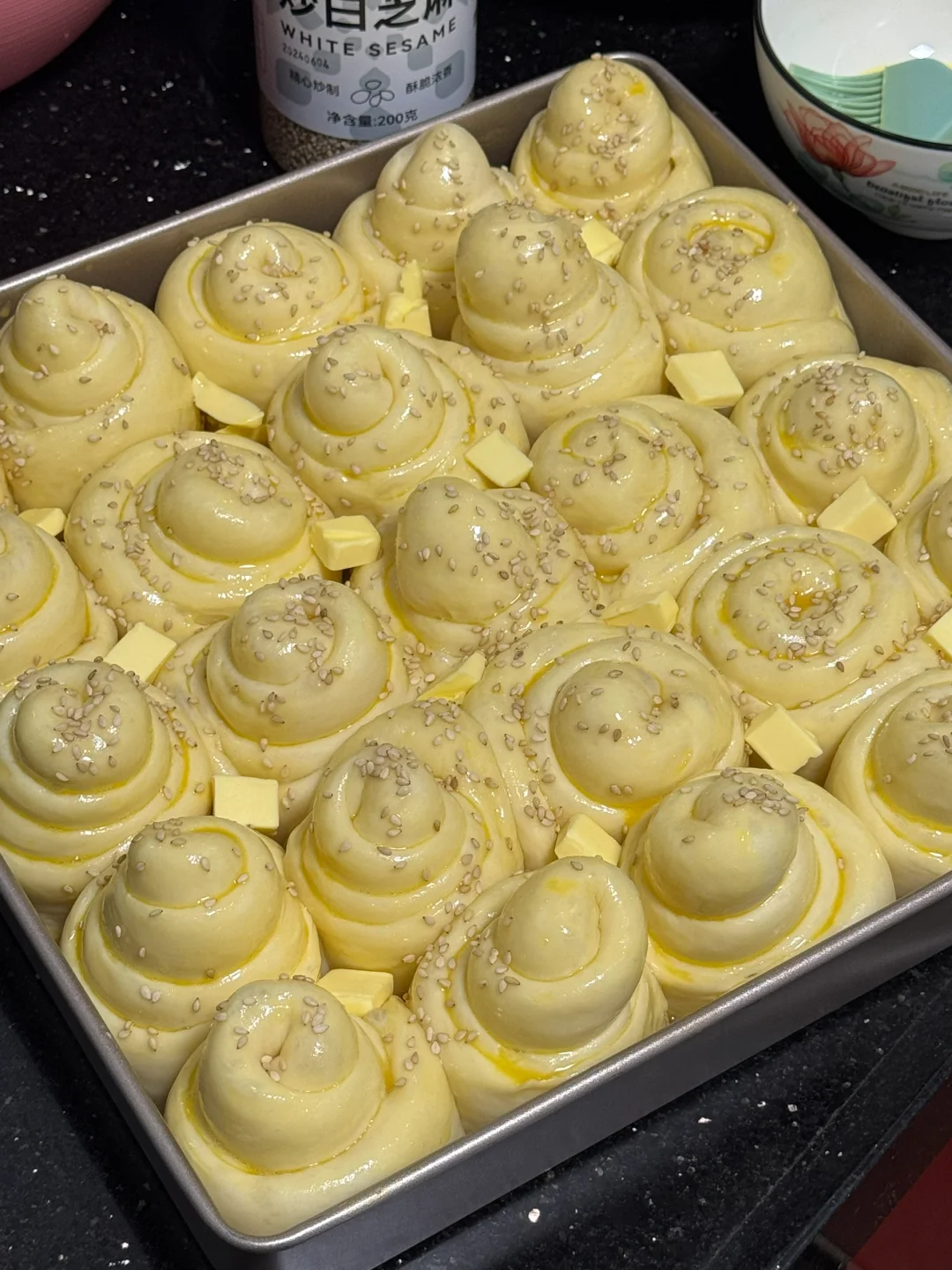 3.面团松弛好后再进行第二次擀卷,烤盘刷油,把卷子对半切开,底部先沾蜂蜜水再沾一层芝麻脆底,放入烤箱30度发酵40分钟,表面刷上一层全蛋液,撒上白芝麻增香,可以在缝隙塞一些黄油,烤出来会更香。