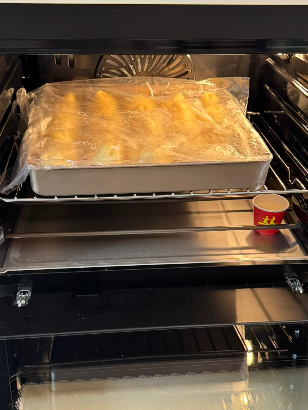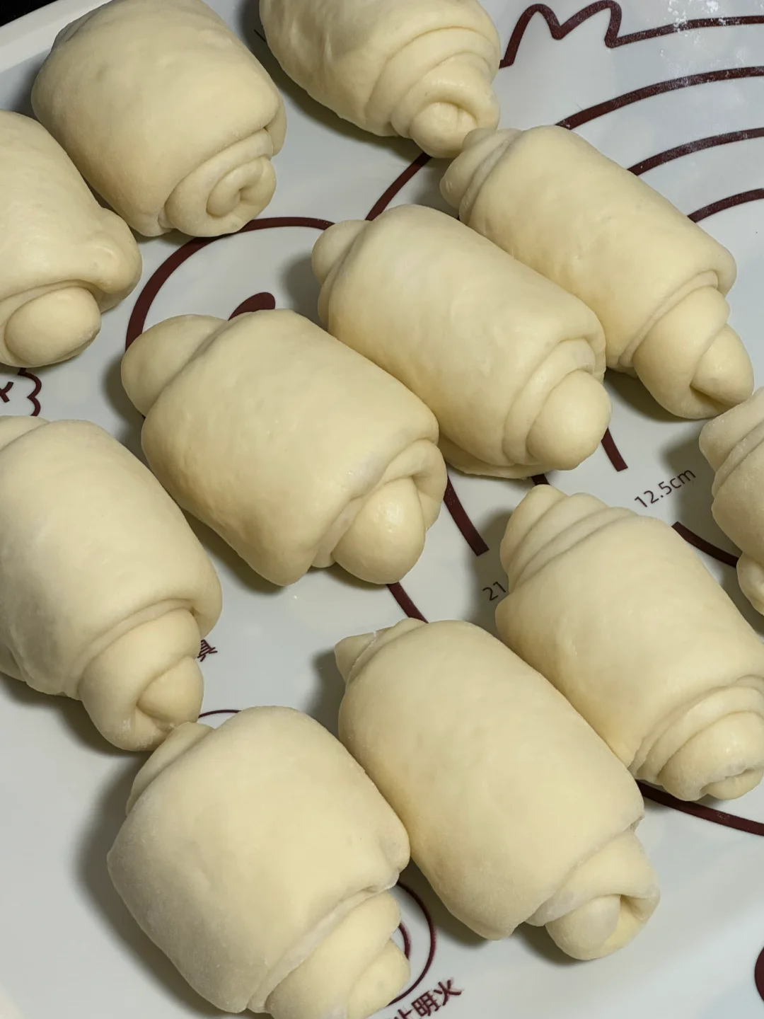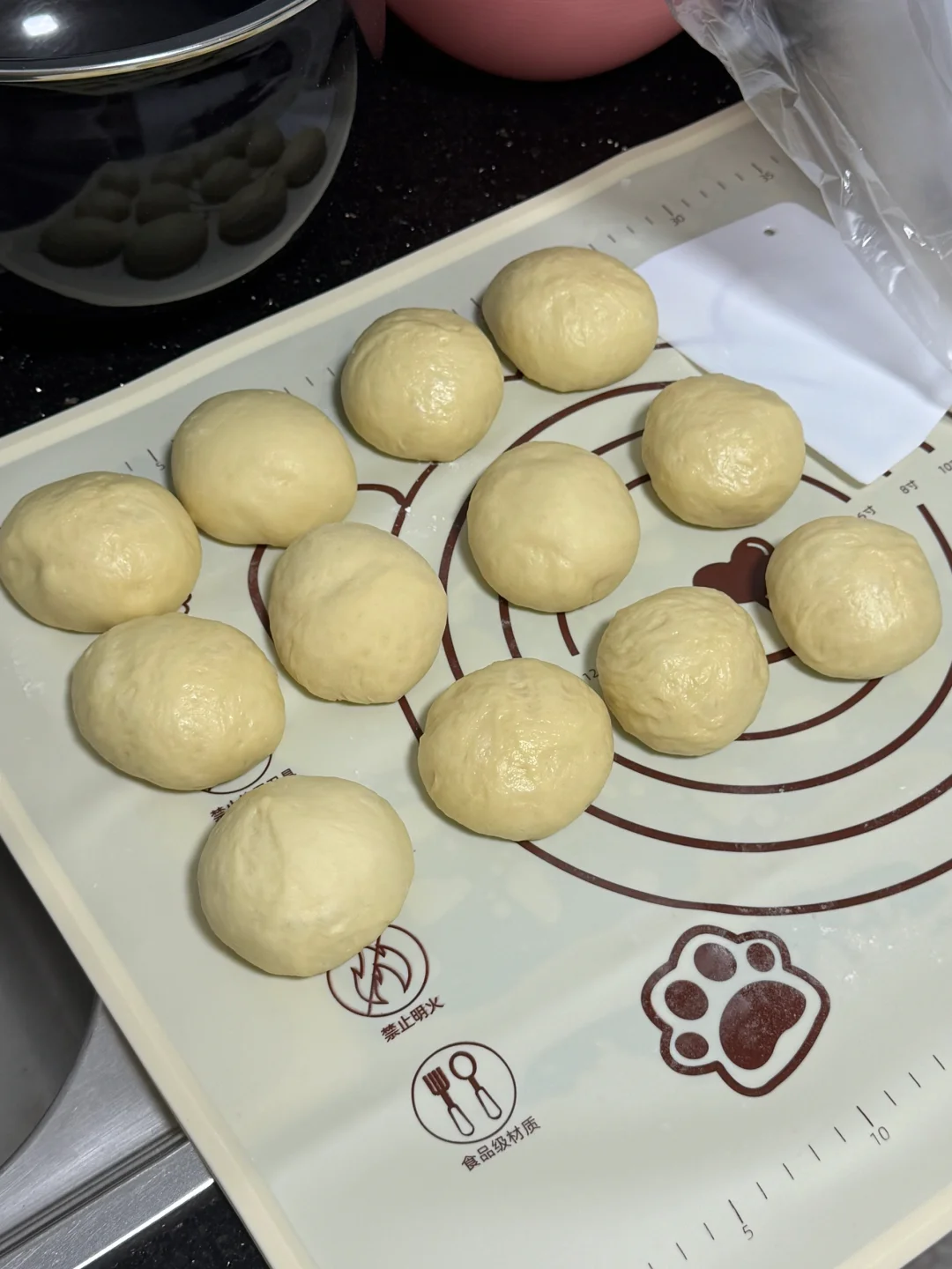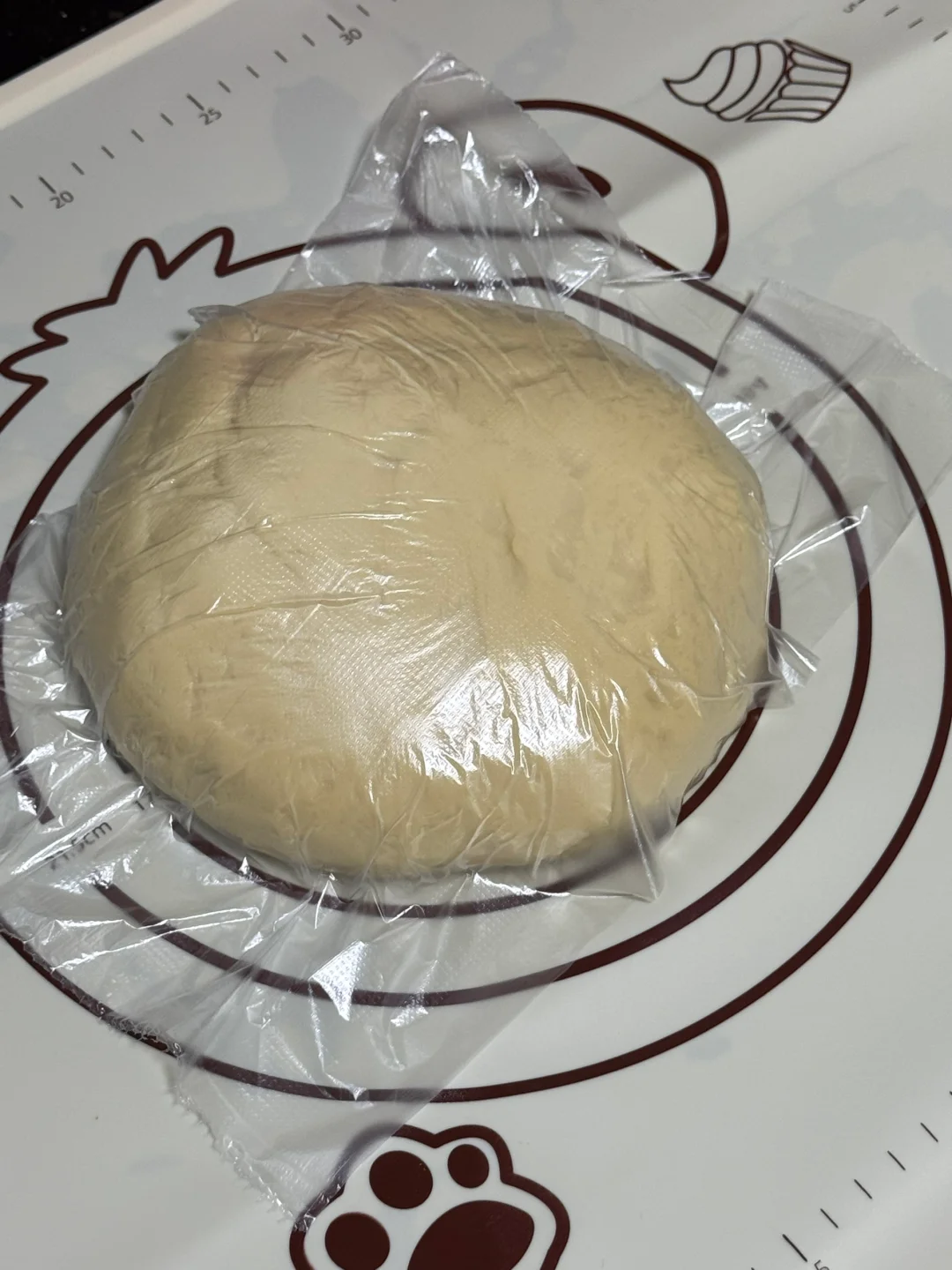 2.整理一下面团,室温松弛30分钟,松弛好之后分割成12份,每份65g,盖上保鲜膜松弛20分钟,松弛完之后进行第一次擀卷,盖上保鲜膜继续松弛20分钟。