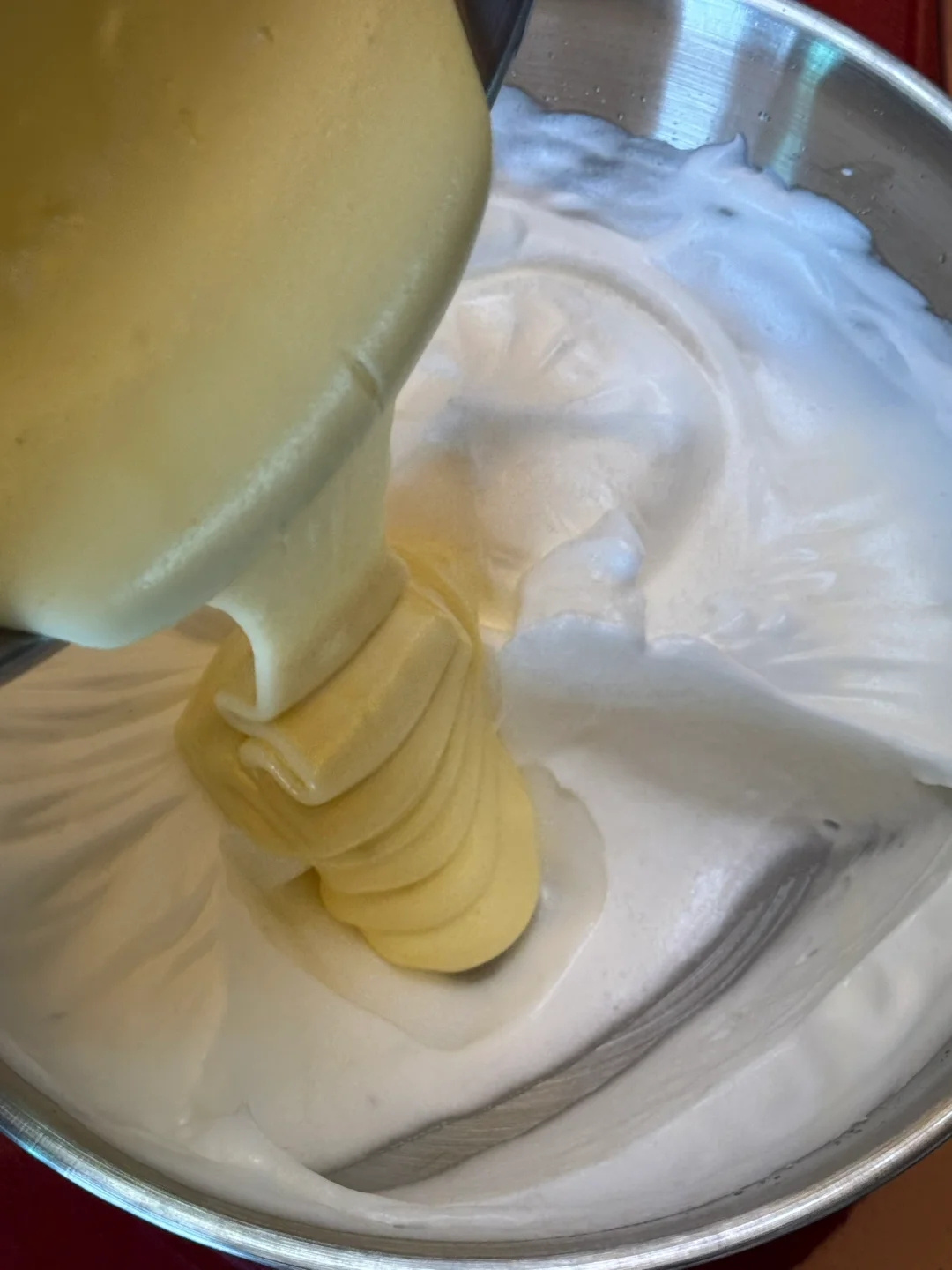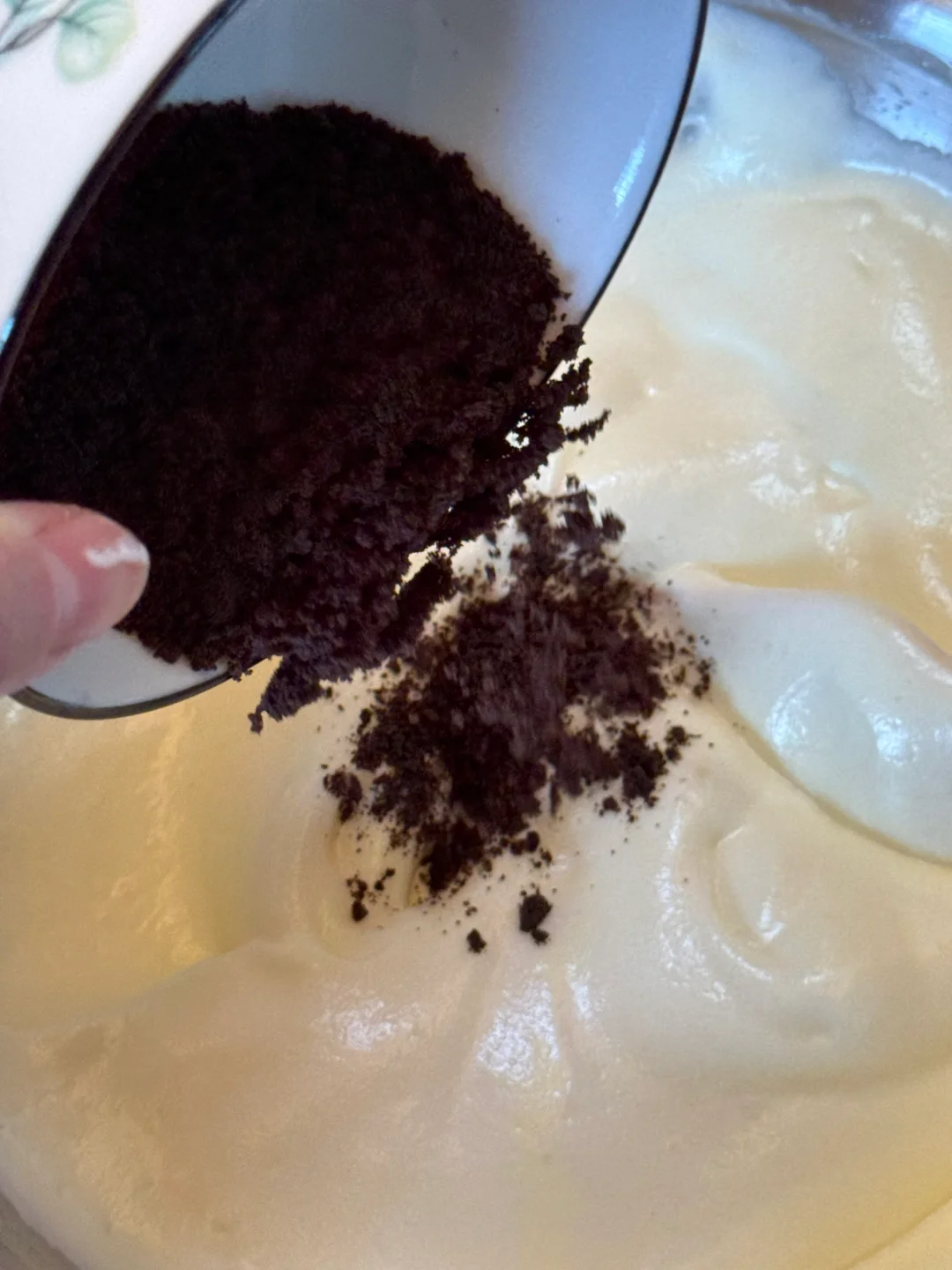 4.与蛋白霜混合均匀,蛋黄糊加入蛋白霜翻拌均匀,再加入奥利奥饼干碎翻拌均匀。