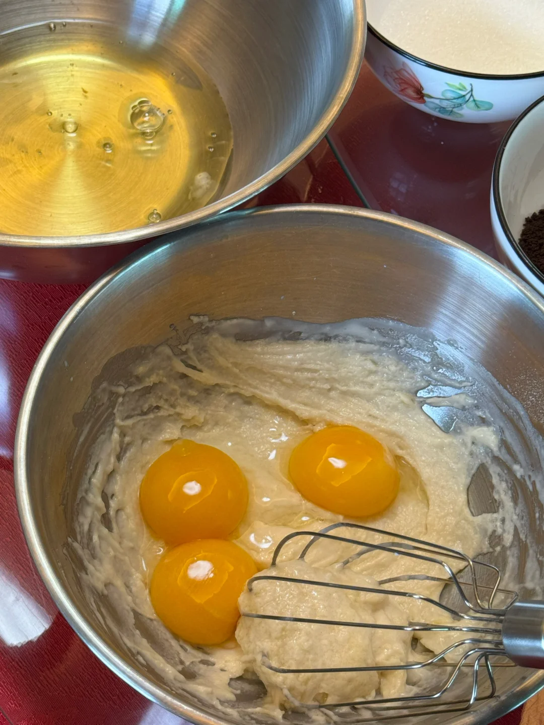 3.蛋黄蛋清分离,蛋黄加入面糊中,搅拌均匀,面糊滴落状就可以了并且很细腻。