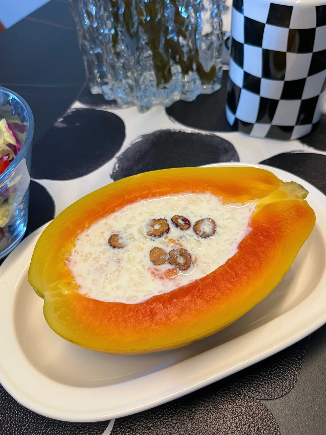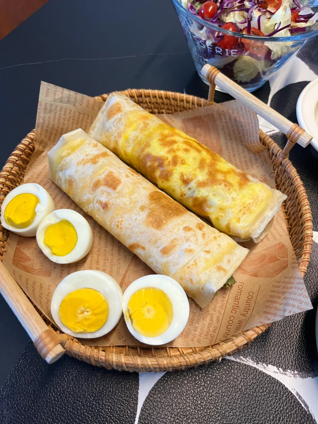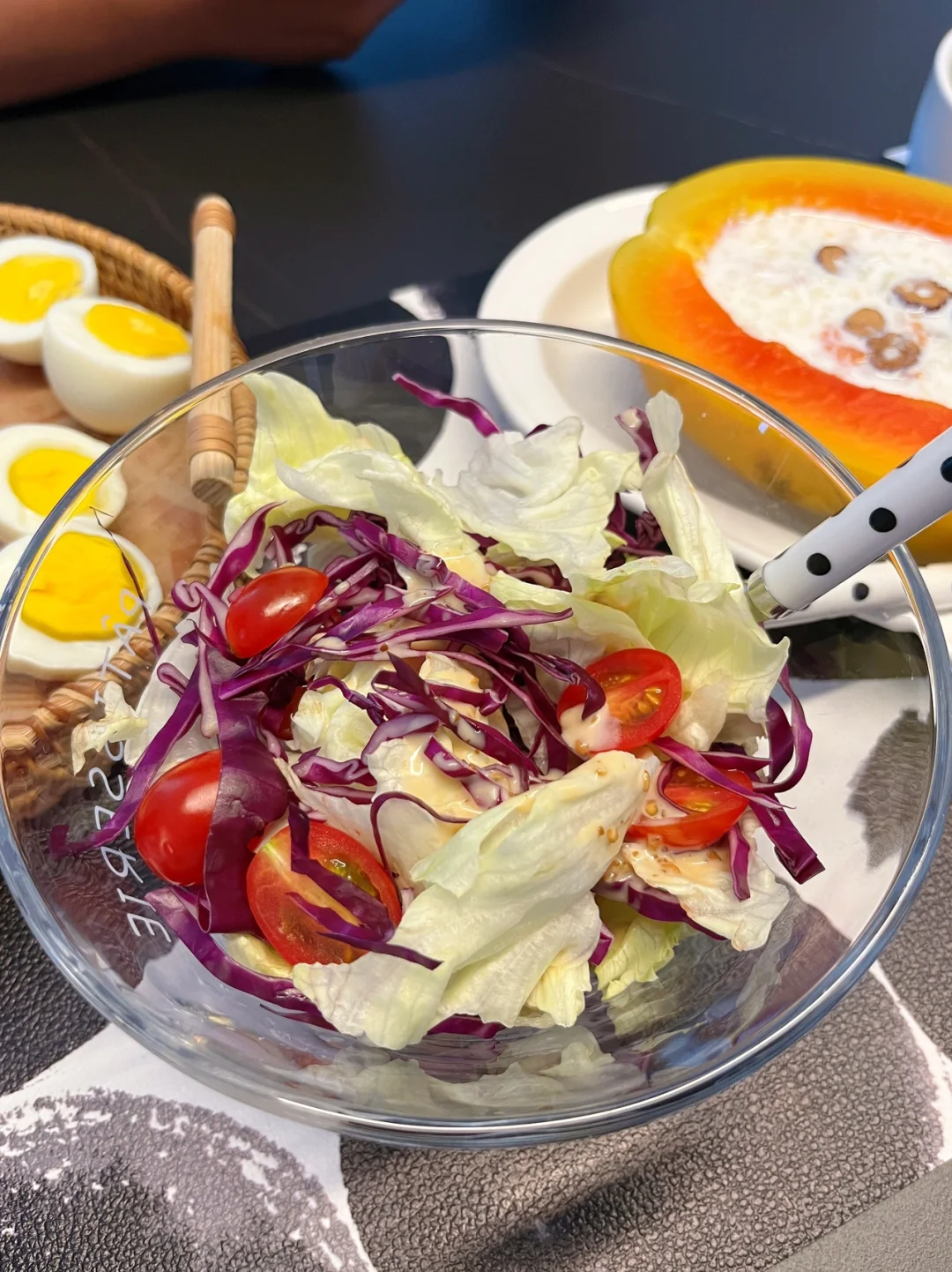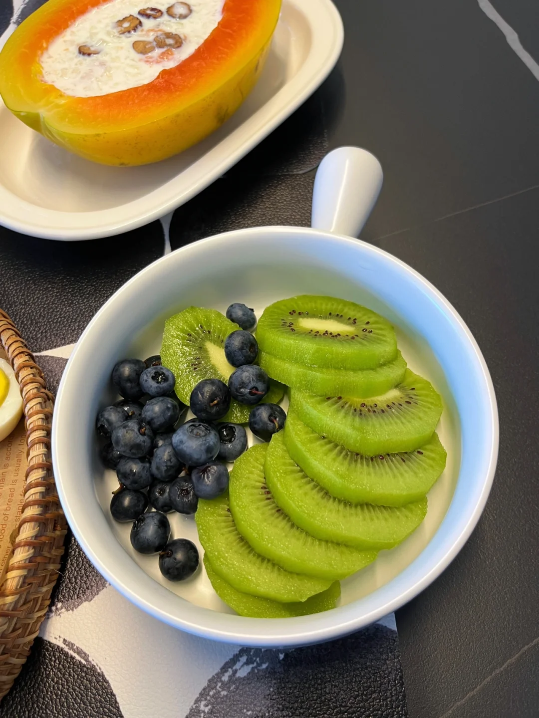 今天的早餐打卡: 鸡蛋灌饼 水煮蛋 木瓜燕耳羹 水果拼盘 生菜沙拉拌