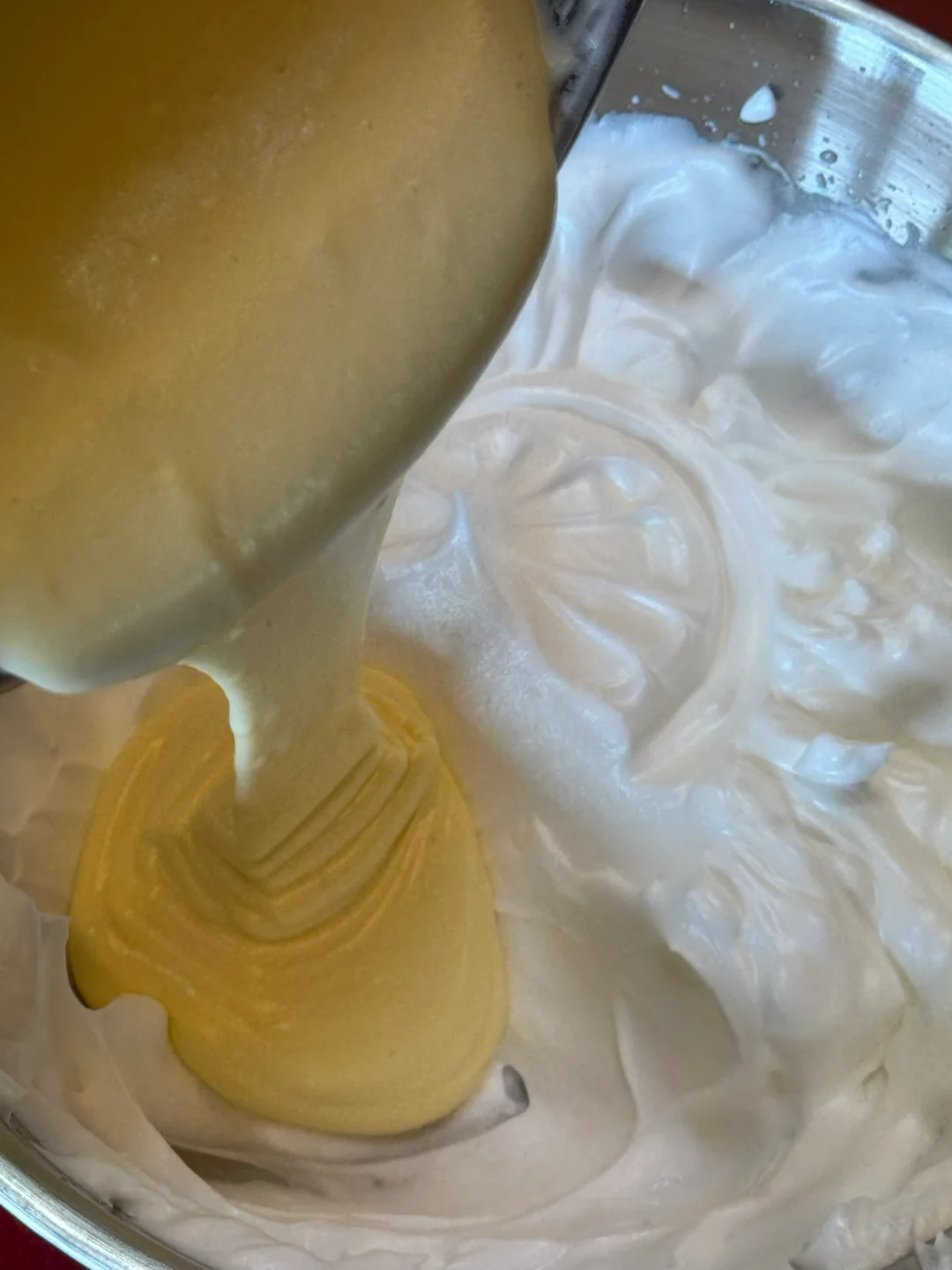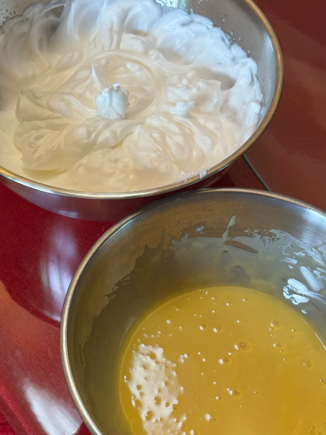 2.蛋清蛋黄分离,蛋清拿去冰箱冷藏一会儿,蛋黄与面糊搅拌至顺滑,蛋清加入柠檬汁、细砂糖打发至硬挺的小尖角,取一部分蛋白霜与蛋黄糊翻拌均匀,再倒回蛋白霜中翻拌均匀,再取两小勺翻拌好的蛋糕糊放入小碗中,加入适量可可粉,翻拌均匀。