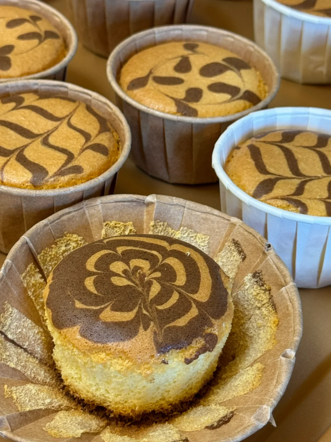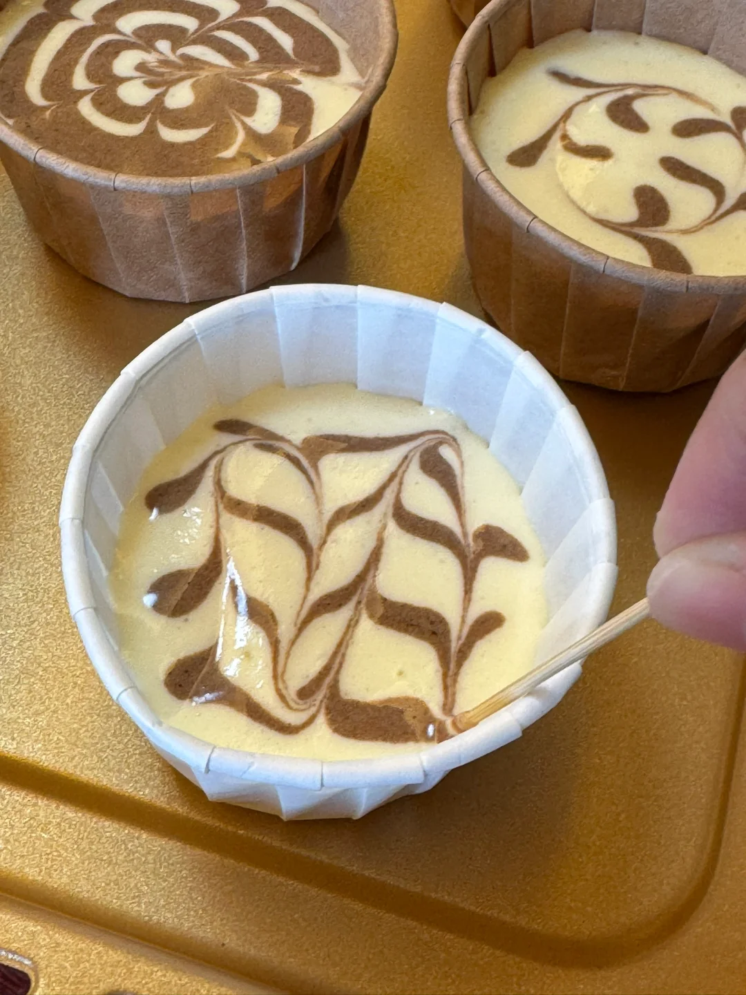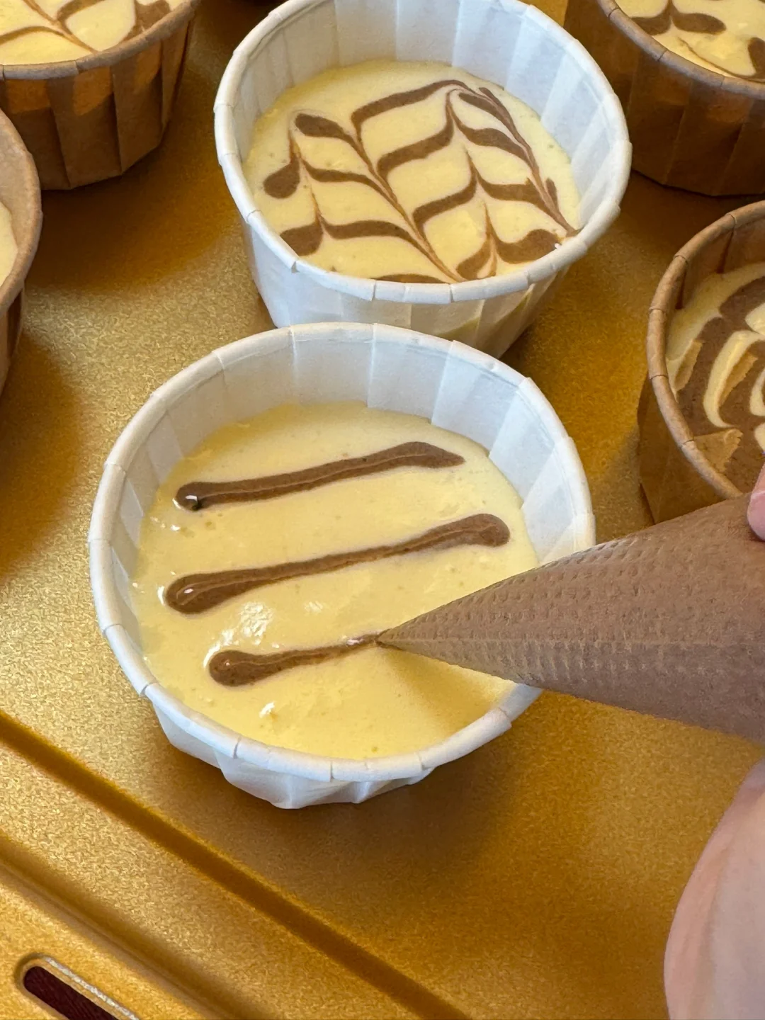 3.原味蛋糕糊、可可面糊分别倒入裱花袋,挤入纸杯7分满,不用挤得太满哦,用牙签划一下,可可面糊的裱花袋剪一个很小的口,开始拉花,自由发挥哦,然后用牙签划出造型。