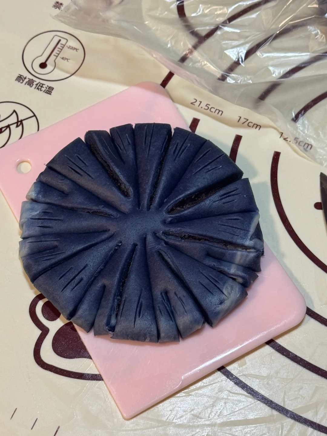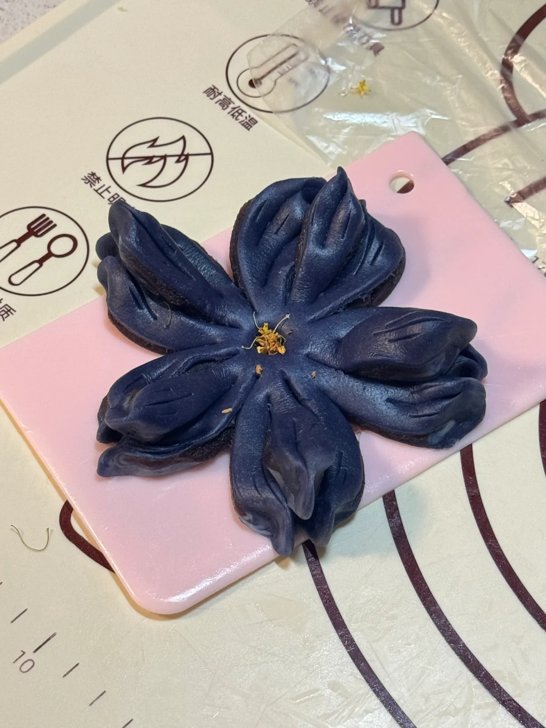 4.用擀面杖擀成小饼,可以稍微擀大一些,因为我们做的花瓣比较多,用一个刮板垫在下面,左右各一刀上下各一刀,在4等份中间再切就变成8等份,在8等份中间切就成了16等份,每隔一片花瓣再切一刀,再拿出锋利的小刀,做它那种花瓣纹理的感觉,独立的大花瓣割上三刀,分开的小花瓣割一刀就可以了,全部割好后,分开的小花瓣垫在下面,独立的大花瓣捏好放在上面,这样整体看起来就很有层次感,捏好后中间压一压放上干桂花(如果没有也可以蛋黄液)