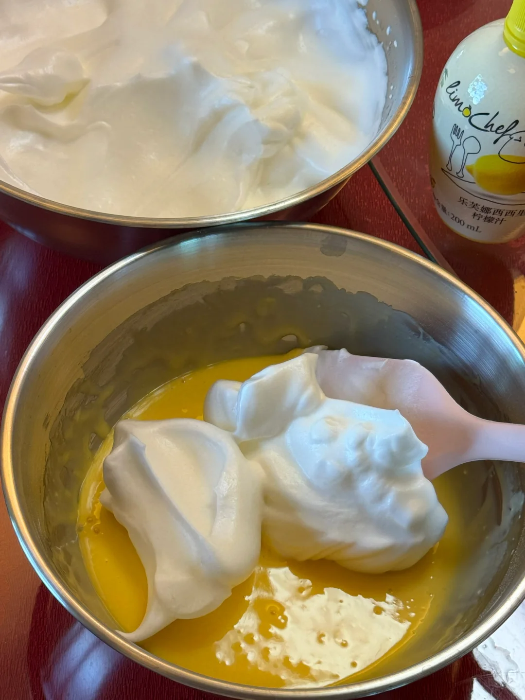 3.蛋清蛋黄分离,蛋黄与面糊搅拌至顺滑,蛋清加入细砂糖、柠檬汁打发至提起有硬挺的小尖角,取一部分加入蛋黄糊中,再倒回蛋白霜中,快速翻拌均匀,装入裱花袋,挤入纸杯,高处摔落震出大气泡。