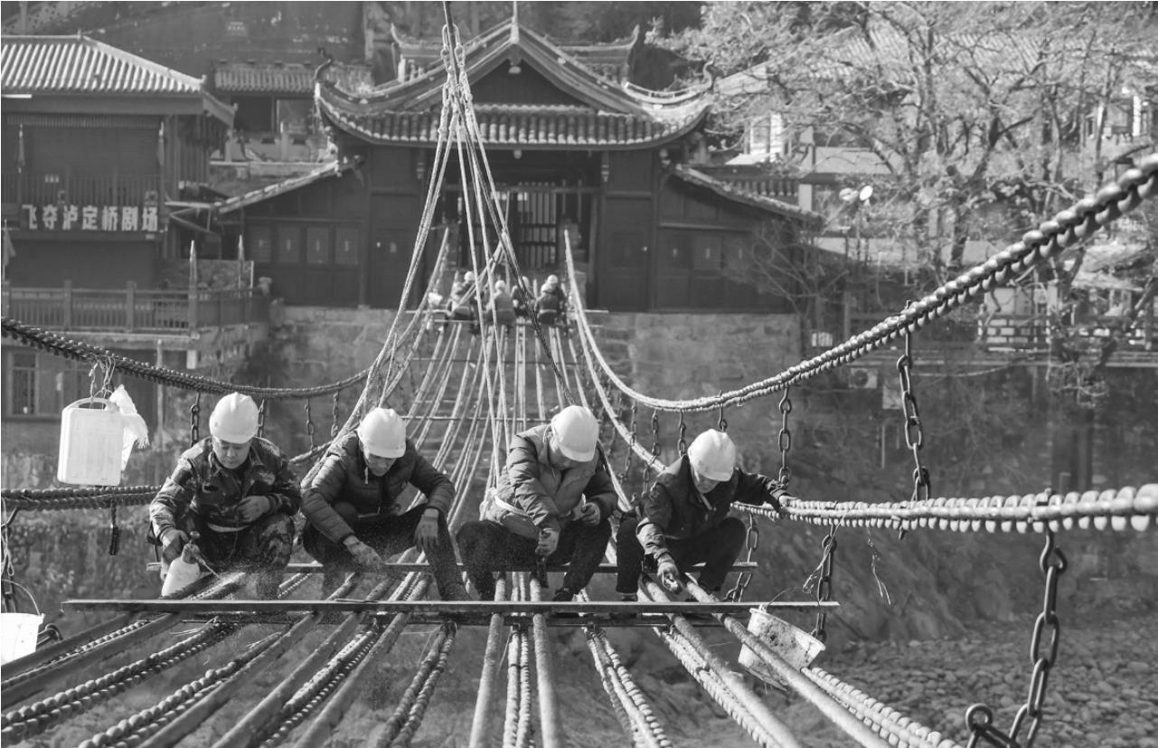 12月17日,工人对泸定桥进行检修维护。四川省甘孜藏族自治州泸定县于近日启动泸定桥检修维护工作,预计12月29日完成。本次检修针对桥梁关键部位开展重点作业,对承载桥梁主体的9根钢缆进行除垢清理并涂抹黄油防护保养,同步更换少量老化桥板。新华社发