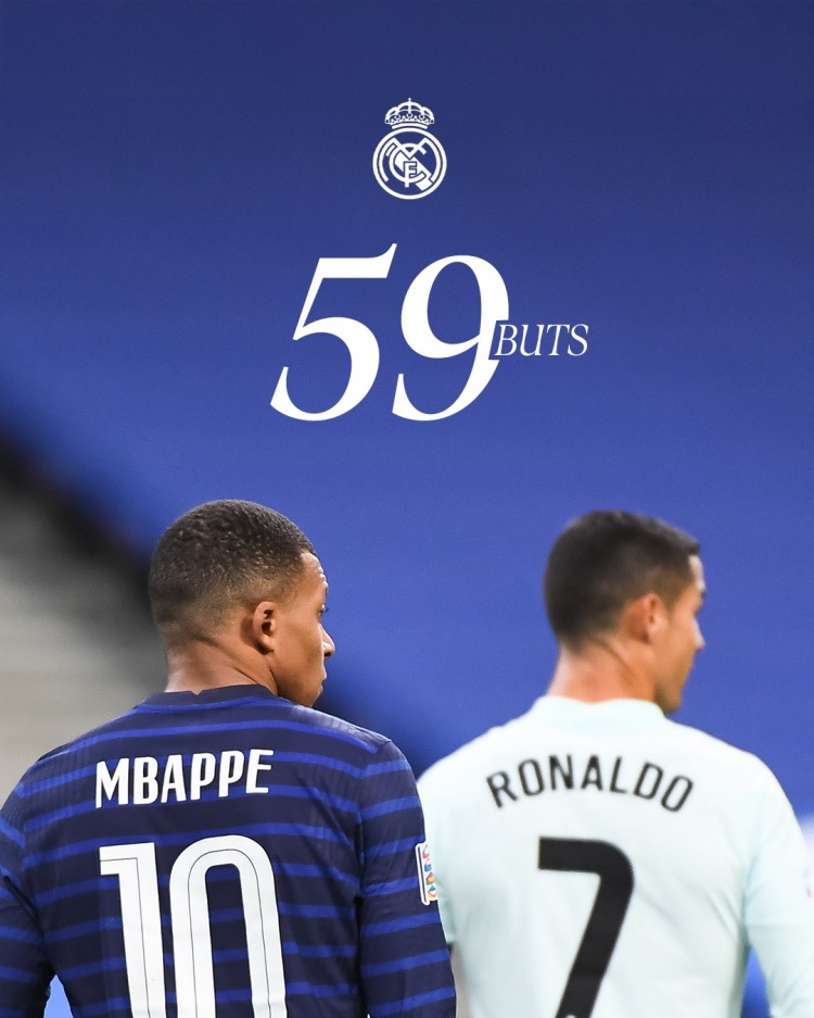 姆巴佩今年为皇马攻入59球,追平C罗保持的皇马球员自然年进球纪录,法国队官方社媒晒出海报,对姆巴佩表示祝贺。